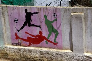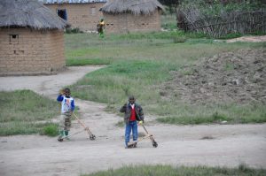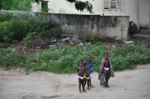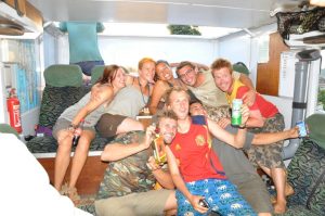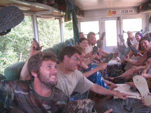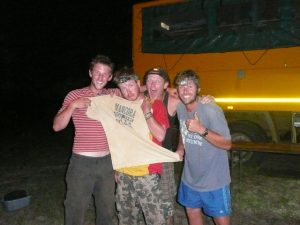 10 Mar: By 7:45 am, we were ready to leave and shortly after 8 am, we crossed out of DRC, entered no man’s land and waited for the Angolan officials to be ready to receive us. The Angolan side eventually wanted to inspect the vehicle, making us all get off while they gave the truck a cursory glance. After two painfully slow hours, we were finally stamped into Angola and on our way, beginning the start of a 5 day mad dash through Angola to reach the border crossing into Namibia and hopefully not overstay our impossibly short transit visa . We passed the town of Do Luvo, and than drove about 30 KM before stopping for lunch of hummus and couscous…yum. At one point on our drive, we saw a signpost for the city of “Mbanza Kongo”, which was a further 9 KM away. Becky had read about this historic town in the excellent book “King Leopold’s Ghost” by Adam Hochschild, where she learned that mbanza means “court” and Mbanza Kongo served as the capital for the Kingdom of the Kongo, a territory that was about three hundred square miles that had been in place since 1391, a full hundred years before Portuguese explorers arrived. Unfortunately, our Angolan transit visas didn’t allow for any sightseeing, as we were in a race against time to reach the border crossing town of Namacunda in just a few days time. So on we drove and after lunch, we finally hit tarmac and were starting to make good time, but were stopped and pulled over by Angolan police who yelled at Chris for not stopping at a check point (he had been waved through), and ridiculed those that were on the beach waving to the locals, saying that it was not allowed. How random is that? We were able to drive a further 150 KM today and started a late afternoon truck party for Luke to celebrate his 25th Birthday in Angola. Robby made a concoction of Pina-gin-lada and Kendra and Ruth showed their artistic ability by drawing a kneeling Monica Lewinsky next to our Senator Clinton gin bottle. Good times were had by all. We pulled into a bush camp at 6:30 pm and had the tents set up by a watering hole. The boys made Angolian BBQ for dinner (2 hotdogs each), and the frogs kept us up all night with their loud croaking. Total distance drive today: 236 KM.
