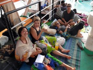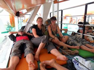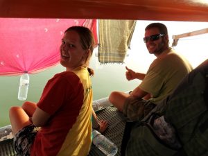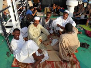 3 Aug: We knew the next 24 hours would most likely be some of the most miserable of the trip, so everyone tried their best to sleep in this morning. When we finally woke up, everyone took their time packing their bags and getting themselves sorted for the ferry ride from Wadi Halfa to Aswan. The temperature was already soaring, so we kept drenching ourselves in the shower to cool down. Our highly anticipated bus finally arrived just before noon, and we said goodbye to the welcoming Kilopatra Hotel for a short bus ride to the harbor. It was packed on our bus and poor Luke, Sean and Chris had to squat or bend over for the entire ride. Once at the main harbor area, we were told to stack our bags in one location, and sit in the waiting area. Thus, the long “hurry up and wait” process began. Eventually, we were handed our boarding tickets, got our passports stamped out of Sudan, and managed to get some lunch down before a massive queue to get inspection stickers on our bags (which promptly fell off). Then it was a fight to get loaded up onto the bus for another ride to the ferry. Since we were the last ones to get our luggage inspected, we were one of the last to get onto the ferry and all the good spots under the lifeboats on the top deck were already taken. We squeezed in under one of the boats, and put out our grass mat to allocate some space for ourselves. It was crowded, hot, and uncomfortable and morale was not high as we realized we likely had another 20+ hours of these arduous conditions. Chris brought the truck tarp and he enlisted a couple of the guys to assist in getting it strapped up so that we would be out of the sun. It was very hot, and anyone making the mistake of touching the upper deck with their bare feet paid for it immediately. While boarding the boat, we were handed a dinner coupon and Chris told us that the kitchen was already serving food in case anyone wanted to catch an early dinner. We figured that it would be ideal to beat the mad post-Ramadan rush to dinner, so around 5:30 pm, we fought our way down the stairs to the first deck where we cashed in our coupon for a meal of chicken, mashed potatoes, tomato/cucumber salad, bread, and pasta. Our ferry was supposed to depart at around 5:30 pm, but it was around 6:25 pm when we finally heard the engines start up and then we were finally on our way. The top deck was getting more and more crowded, and there were a bunch of young, immature men who started taking inappropriate photos of the girls and making lewd comments. They would either stare the girls down or sit down right next to them on the deck space making it an uncomfortable situation. Everyone could immediately tell the Egyptian influence as up until now, the Sudanese men were very polite and respectful. Unfortunately, their Egyptian counterparts were quite the opposite, as they stared, whistled, took photos, and generally molested almost every single foreign girl on the upper deck. Once the boat started going, there was finally a breeze, so we read until it was too dark and then tried to catch a few hours of sleep. Chris had briefed us that four hours after departing Wadi Halfa, we would be able to see a lit up Abu Simbel on the left (port) side of the boat. Sure enough, it was a gorgeous sight to behold although quite impossible to take any photos to do it justice. It was extremely crowded under our lifeboat and we divided it up into three sections, with Damien/Anna and Marie/Lars in one area, followed by the two of us, and then Lucky/Naomi and Katherine/Kendra in the last section. We had loaned Ally our grass mat on the outside deck, but she awoke to find a guy sitting right next to her making lewd comments, so she immediately packed up her stuff and asked if she could lie down beside us. Anna angrily protested that the other lifeboat had only 6 people beneath it (Sean/Sara, Mel, Matt and Laura/Lydia) but Ally insisted she had a right to sleep wherever and if anyone else minded, they could feel free to move. We didn’t weigh into the controversy and it was a cramped night’s sleep as we were literally head to toe with each other all night long. Thankfully there was a breeze, albeit a hot one, but at least we weren’t sweating profusely despite the high temperatures. At around 11 pm, Nancy came by to tell us that the immigration official was stamping us into Egypt, so she needed everyone to come downstairs immediately to get that sorted out. It was a fairly pain free process, although we had to walk the gauntlet of men to get down to the lower deck and some of them harassed a few of the girls who weren’t appropriately attired…Goodbye Sudan and Welcome to Egypt!