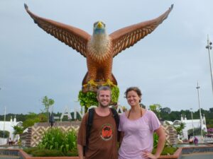 19 Nov: Woke up early for a morning workout before our cruise docked at Langkawi, which has been a duty free zone since 1986, luring visitors in by the hordes whose only intent is to cart off cheap booze. We didn’t have any set plans for today, but were keen on visiting some of the 99 islands that make up Langkawi’s archipelago. The misty morning view of Langkawi did not disappoint, and we were eager to disembark at 8 am to give us a full day here. Unfortunately, getting the Vietnamese members of our group to consolidate at the agreed upon meeting place was like herding cats, and we wasted over an hour looking for Ji Sung who was not to be found. Unbeknownst to us, she had already disembarked the ship! The rest of us were on deck 5, searching fruitlessly for her. Very frustrating to say the least. Di Tam and Di Phuong decided that they would stay on the Costa Victoria in case Ji Sung showed up, while the rest of us disembarked and saw a sheepish Ji Sung waiting for us in the parking lot. Arrrgggh. Traveling with non-English speaking family is enough to drive us insane at times. Becky did an about face to find Di Tam and Di Phuong who had already disappeared and it felt like we would never get our morning started. She searched for them all over the ship before finally deciding to carry on with the original plan of meeting Robby at the end of the dock where he had already coordinated an island hopping tour and was waiting patiently. Once there, Bob and Ann agreed to try one last time to find the missing members of our group, so we waited around for another 30 minutes until our entire group of 8 was reunited at last. What a waste of our first 2.5 hours in Langkawi! Robby had coordinated a 3-5 hour island hopping tour for the 8 of us for a price of 300 MR (the exchange rate was $1 = 3.05 MYR), so not too shabby considering that cruise wanted that much for one person! Our tour included our own private boat, driver, and visits to Tasik Dayang Bunting (Lake of the Pregnant Maiden), Pulau Singa Besar (for eagle feeding), and Pulau Beras Basah, one of the nicest beaches in Langkawi. The day started off brilliantly, with perfect weather as the emerald isles glimmered in the sun. Langkawi is a gorgeous archipelago and we would love to spend some serious time here. Our first stop was at Tasik Dayang Bunting, which required a short hike inland to reach the fresh water lake. Cheeky monkeys were stealing food from visitors, and they were quite aggressive. Once at the lake, we dipped our feet into the water and had to stop ourselves from squealing when hungry catfish swarmed our feet looking for a tasty snack. Half of our group took a dip in the lake (reputed to cure infertility problems), and afterwards, we loaded back onto our boat for the next stop on our itinerary, the eagle feeding session at Pulau Singa Besar. Unfortunately for us, the weather took a turn for the worst, and it started pouring down with rain. There were literally dozens of eagles soaring the skies above us, but they weren’t feeding for the first 10 minutes as there were far too many boats for their liking. Once several boats departed, we witnessed eagle after eagle skimming the surface of the lake to retrieve food that had been thrown out by the various boatmen. Pretty majestic birds but our photos were absolute crap since we had to contend with the rain. Our last stop of the morning was a visit to Pulau Beras Basah beach. A little bit of liquid sunshine sent all the tourists scurrying for cover beneath the trees and nearby restaurants/shops. We laughed as we hopped out of our boat and into the exquisitely warm sea water. It was much warmer being submerged in the sea that getting pelted by the cold rain on land! Even though we had an hour to relax here (or more if we wanted), we had enough after 30 minutes, so we asked our boatman to return us to the dock where we thanked him for our morning excursion. Since it was lunchtime, we figured we might as well head back to the cruise ship to get a free lunch, followed by a dip in the hot tub to warm up. After lunch, we figured we had enough time to make a quick visit to Kuah, where we planned to stock up on duty free and see Eagle Square. We tried to negotiate with the taxi mafia for a fair price for all 8 of us, but after realizing that they weren’t in a bargaining mood, just blew them off and rented a motor bike for the remainder of the day (40 MYR fixed price whether we had it all day or just for an hour…still cheaper than taking a taxi). Our first stop was at the Underwater World complex in Pantai Cenang where we were able to get some Malaysian Ringgit. It was a scenic ride out to Kuah, which was a bit further away than we had originally anticipated. Finding Eagle Square was straightforward (Langkawi is famous for its eagles, with its name meaning “reddish brown eagle” in Malay), and we saw lots of duty free shops in Kuah. However, the thought of lugging a bunch of alcohol back to our cruise ship did not appeal for the long ride back, so we made a detour at the Underwater World duty free shops and were wowed at how cheap alcohol is in Langkawi. So cheap that we purchased 8 bottles (2 for us and 6 for Bob’s Singapore friends) and headed back into port to return the motorbike. Robby smuggled our rum in his beer belly, while Becky sauntered back on board the cruise with 6 bottles of alcohol. Of course the alcohol was flagged and held in storage, but Becky managed to sweet talk the staff into delivering all 6 bottles to our stateroom the night before we visited Singapore, even though that was not our final port of disembarkation. Costa staff aims to please and we really appreciated their helpfulness in this situation (as alcohol in Singapore is ridiculously priced and Bob’s friends were keen to get as much as they could from our visit). Our afternoon was spent enjoying cocktails while we bid adieu to Langkawi. Overall nice stop but we would have preferred maximizing our 