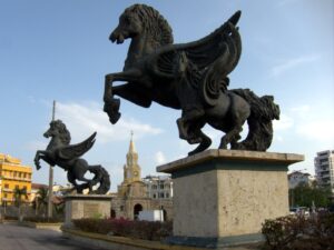 Massive bronze horse statues, known as "Muelle de los Pegasos" greet us as we wander towards the old city of Cartagena, an infamous slave port