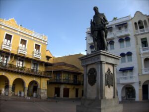 The statue of the city's founder, Pedro de Heredia, stands in the middle of Plaza de los Coches, which was once used as the main market area for slaves in Cartagena