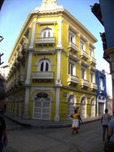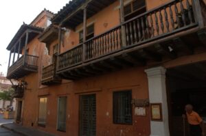 Colorful houses capture our attention during our city stroll of Cartagena