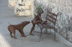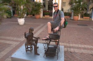 Robby planting a kiss on Botero's La Gorda Gertrudis (or reclining lady) in Plaza de Santo Domingo