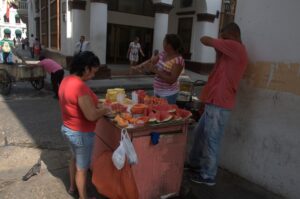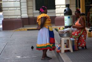 An early morning discussion between two "Palenqueras", iconic Afro-Colombian fruit vendors