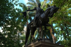 Statue of Simon Bolivar on horseback at the shady and pleasant Plaza de Bolivar