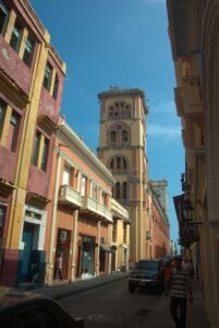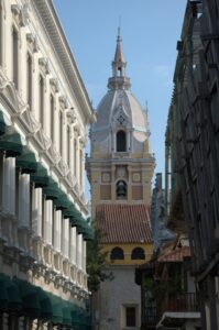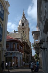 Cartagena's Cathedral Tower as seen down one of the city's many narrow streets