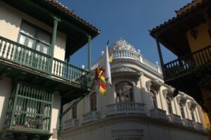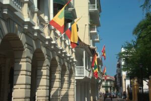 Cartagena and Colombia flags adorn an old colonial building; Plaza de Bolivar
