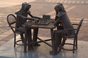 Chess players deep in contemplation; Square outside Iglesia de San Pedro Claver