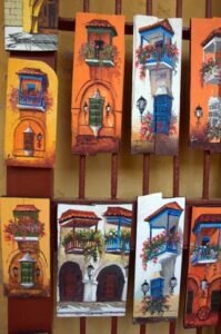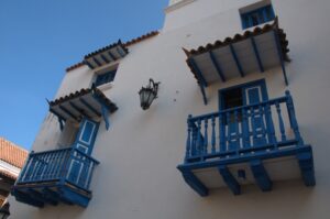Charming wooden balconies overlooking the streets of Cartagena are a common sight