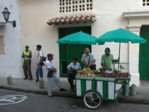 A man and his pushcart weave their way through old Cartagena