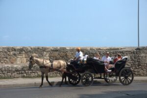 Tourists enjoying a horse & carriage ride through old Cartagena