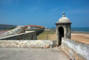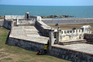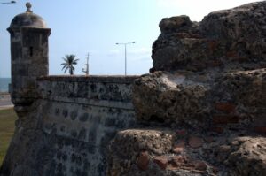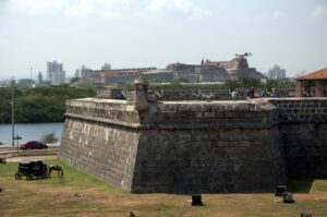 View of Cartagena's city walls with the fortress of Castillo San Felipe de Barajas visible in the background