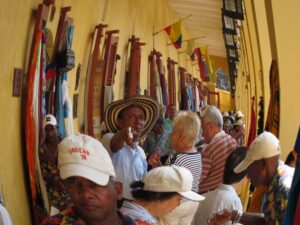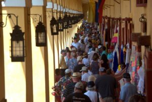 Fish eye view of Las Bovedas, a bustling marketplace for Colombian goods, handicrafts, artwork and clothes