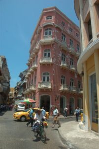 This architecturally interesting pink corner building caught our attention in old Cartagena