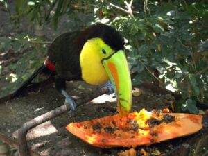 A hungry toucan feeds on papaya