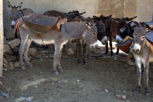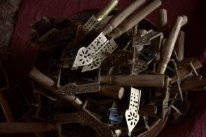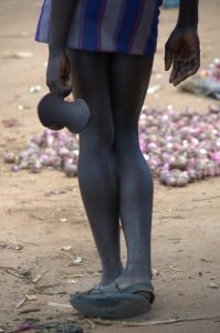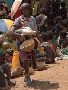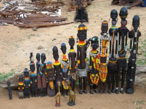 21 Nov: Breakfast was a leisurely affair as we weren’t set to leave until 9:30 am. Today we planned to visit the Thursday Key Afar market, which didn’t get lively until well after 10 am. The drive from Jinka to Key Afar took us just over half an hour, and we passed by more Binna stilt walkers along the way. Abenezer felt it was still a bit too early to head to the market, so he recommended we relax in the garden of the Zarsi Hotel (where it appeared every single tourist 4×4 was parked), and order up a cup of tea. By 11 am, we felt that we had killed as much time as possible, so we walked down to the market area with Abenezer. At the Key Afar market (unlike at the Turmi one), it was mandatory to hire a “guide” (200 Birr per group). We were happy to pay a fee to be left alone, and the guide was more than happy to comply. Robby hooked up his GoPro camera to see if he could get any stealth video of the market. The Key Afar market was spread out, and at first glance, we really preferred the Turmi market more (even though most travelers rave about the Key Afar market). The Thursday market here is famous for drawing in hundreds of Banna, Hamer, and Tsemay tribe members. No one paid us any mind as we wandered through taking photos and checking out the merchandise for sale. We were keen on getting a local stool that appears to be “mandatory” for all men of the Omo Valley. Several wooden statues caught our attention too, and we figured we could return later to bargain down the price. We had the market pretty much to ourselves for the first two hours until large jeep loads of tourists started pouring in. That was when we decided it was time to check out the items we wanted to buy. Our lunch meal (preordered and prepared by the Zarsi Hotel staff) was going to be augmented by some avocados that we bought for 4 Birr (bargain). An entrepreneurial Banna man parted with his stool for 70 Birr. Then the fun began. We had been attracted to a pair of carved wooden statues that we wanted to buy as a set. However, the starting price was well outside of the range we were willing to pay. Negotiations stalled when the vendor’s best price was $150 compared to Robby’s offering of $40. It is obvious that the vendors here cater to the large tourist market, and they will eventually get their asking price if they play the waiting game. Realizing that it was futile to bargain any further, Becky found another pair of tribal statues that looked even better than the first pair. The second set was about double in size of the first set, so we were a bit unsure of how they would fit in our check-in luggage. The seller told us that another couple had offered $175 for the set which he had turned down. He wanted an additional $25 to seal the deal. We hemmed and hawed and put on an indecisive show even though our minds were already made up. Eventually, Robby managed to seal the deal at $170, laughing that the seller should have taken the first couple’s original offer! While this was way more than we wanted to spend, these were unique souvenirs that would always remind us of our time in the Omo region. Back at the Zarsi Hotel, we had a lunch of spaghetti with meat sauce along with freshly sliced avocados…yum. From Key Afar, we drove onward to Konso. Our itinerary was a bit convoluted as we were non-negotiable about missing the Saturday market in Dimeka. Abenezer had suggested a visit to Konso (which we had zipped right past when we first drove down to the Omo Valley), before backtracking to Turmi/Dimeka on Saturday. Even though it was 4:30 pm when we pulled into Konso, its bustling Thursday market was still in full swing. Konso women wearing their uuwa (woven skirts) dotted the market area. Men with sewing machines posed alongside stacks of colorfully striped pieces of woven cloth, making for a picturesque scene. There were hundreds of rubber tire shoes for sale at the market…perhaps where all the tribes of the Omo Valley get their foot gear? A drunk and incoherent Konso man followed us around, blabbering in an unintelligible language. We had no idea what he was saying, but it was obvious that he was fishing for a tip as he accompanied us back to our parked car. We were as kind as possible as we dissuaded him from following us any further and eventually he stumbled off to bother someone else. Just down the street from the market were several budget hotel options. We initially checked out St Mary’s Hotel, but Abenezer suggested a look at the Konso Edget Hotel as they supposedly offered better food. Rooms at both places were basic, and we ended up settling down in a double room at the Edget Hotel for 230 Birr. If you ever stay here, check out the toilet! It is a standalone toilet located in the MIDDLE of the bathroom, not hooked up to anything (bucket flush). Totally random! We planned to have dinner at the hotel restaurant, so we went out to the courtyard area where there were a few different places to sit. After choosing a table under a thatched hut, we asked for a menu and quickly decided what we wanted. However, the “waiter” was nowhere to be found. It ended up being such a surreal experience because it was virtually impossible to order anything here. Robby had to make his way into the kitchen area to try to solicit some drinks (surely they could handle that simple task). But when he tried to place an order directly with the chef, he was told that they had nothing to offer for dinner but eggs! No pasta, no meat, no bread, but yes, there are eggs. Someone mentioned something about fasting day and special menu, but we really didn’t understand what was going on. We saw some locals at a nearby table enjoying a meal, so we pointed to their food and asked for the same thing, but after waiting patiently for another 30 minutes, it became painfully obvious that we were not going to be served here. It was a bit bizarre as this was the first place in Ethiopia where the staff didn’t appear to be interested i