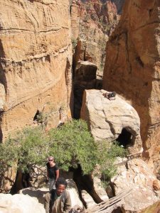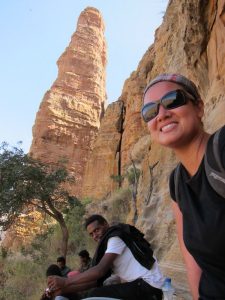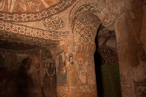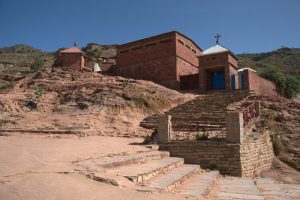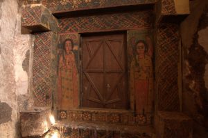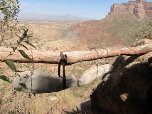 11 Nov: The night was a bit loud with dogs barking outside incessantly. Also, some kind of motor would start running in the wall of our bathroom and then stop about every hour or so. Thus, neither of us had a restful night! At 7 am, we went down to breakfast. We found that we could have paid 40 Birr with the room rate for breakfast included for both of us. Paying for breakfast separate was 50 Birr each plus taxes, so we ended up spending 121 Birr instead of 40. Oh well, breakfast cost us $6 instead of $2! We met up with Abeba at 8 am and were informed that we would visit some local rock hewn churches in Tigray. The price for our full day excursion would run us $160 for the guide, vehicle and driver, but we would pay for everything else ourselves or $200 for everything included. We opted for cheap option. The plan was to drive to visit a couple of churches that require some challenging hiking and visit some easier ones if time allowed or if we opted for a less challenging day. We were on our way and stopped a little before 10 am at a midway point so that the driver and guide could have breakfast and we could have coffee & tea. We went to a nice little traditional style café that had grass on the floor and smoke in the air to have a drink while the guys ate. The lady making the coffee had Asian features so our guide asked her about her ethnicity. We learned that she has a Chinese father and Ethiopian mother, hence the very interesting and beautiful mix. Our tea, coffee and three 1.2 liter bottles of water ran us 37 Birr. From here, we drove onward to the village of Megab in the Gheralta Mountains to hire a local guide to escort us to the churches (mandatory to hire a guide). The first church we visited was Abuna Yemata Guh. Getting there involved a steep challenging hike up a mountainside and then we had to climb a rock face. Luckily there were local guys waiting to help those who have trouble climbing. Becky was quite pleased to have the assistance, as it was a tough climb up the rock face, especially if you don’t know where the foot and hand holds are. The church had a small collection of human bones just outside in an etched away small room in the rock. People used to bring the dead up there for an “open burial” but they no longer do this. There was also a niche carved into the rock where mothers would bring their babies to be baptized. The inside of Abuna Yemata Guh had incredible frescos, probably the best we’ve seen so far in Ethiopia. After having as much time there as we wanted, we were ready for the return trip. Thankfully, the climb down was much easier. As we descended we saw some other visitors struggling up the cliff face. They hired guides with ropes to hoist them up so that the ‘climb’ was much easier for them. One of the elderly ladies was hyperventilating on a ledge near the top, probably due to her nerves. We were sympathetic as a visit to this church is not one to be taken lightly! When we finally reached the base of the mountain, we decided that one climb was enough for the day and decided to visit two other popular churches that are close to the road and easy to get to. So, our second church of the day was Abreha we Atsbeha, which is considered by some to be the finest rock hewn church in Tigray. It had nice paintings and an Italian portico that was added to the front. Well worth a visit. If we had known that the last church, Wukro Chirkos, had been destroyed by fire by Muslim leader Ahmed Gragn in the 15th century, we both would have agreed to give it a miss. This was the least impressive church of the day, as almost none of the paintings had survived, and the damage to the church itself was intense. By now we were all churched out, so we decided to head back to Mekele. First, we had to make a quick detour to a bank to exchange some money. Back at the Atse Yohannis Hotel, we stopped by the reception to extend our stay for another night. Becky specifically requested that breakfast be included in our second night’s stay but the receptionist forgot as she rang up our bill and then refused to modify it, stating that once the receipt is printed, it automatically gets sent to the government and cannot be modified in any way, shape or form. Robby was pissed and wanted another form of compensation but she refused to help, stating there was nothing she could do other than apologize for making a mistake. We were both perturbed but had no recourse so we went upstairs to grab our room key and went directly to the restaurant for dinner. Robby tried a St George’s Amber beer and lamb tibs, while Becky opted for a safer roasted lamb and chips. Dinner was plentiful and tasty for $12. After dinner we checked email and discovered that ETT had modified our Ethiopian airlines flights, giving us 2 less days in the Omo Valley than desired. We were not happy with the change so we emailed an alternative suggestion and it looked like ETT agreed to it. Becky later got an email advising her to go directly to the Ethiopian airlines office in Mekele to work it out with them directly, with the advice that we should purchase a flight from Arba Minch to Addis on our own. We were expecting to see Abeba tonight but she never came by. So far we have had no luck paying for anything with ETT (for the Danakil tour, for our domestic flights, for our day trip). They are a most peculiar company, relying heavily on good faith with their customers. So far we have scored a free flight and day trip through ETT!