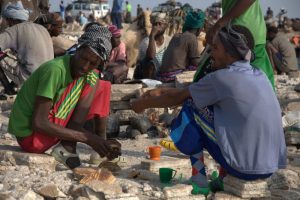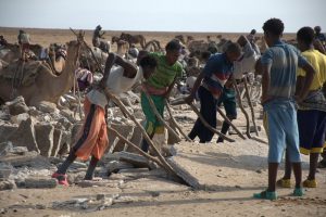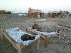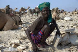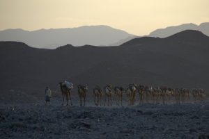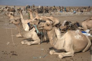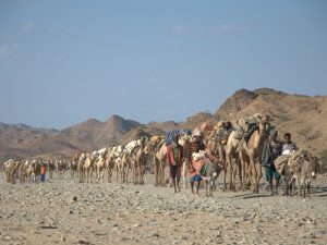 12 Nov: We had to get up early to have breakfast before heading out to the Mekele based Ethiopian airlines office to modify our domestic flights. Our Bradt guidebook indicated that the office was right around the corner from us, but it has since been relocated halfway across town and required a significant hike to get there. Our Danakil Depression tour was set to leave around 10:30 am, so we didn’t have much time to sort out our tickets, and to our dismay, we discovered a long line at the Ethiopian airlines office. However, the strict security guard was keeping the queue in check, and customers were being briskly assisted so it wasn’t a super long wait before it was our turn to sort out our tickets. We had anticipated being charged for the new flight from Arba Minch to Addis, but the helpful assistant was able to modify our original flight (Addis – Arba Minch) for a simple change fee…bonus! And since we had booked it prior to 1 Nov, we scored it at the cheap domestic flight rate. Flights being booked after 1 Nov were about triple/quadruple the price that we paid. After paying for the change fee downstairs at the bank, we brought proof of our receipt back up to the airlines office where our new tickets were issued. All sorted out in under an hour…awesome! We still didn’t have much time to spare as we still needed to sort out what to bring with us to Danakil and what to leave behind, so we hopped in a tuk tuk for the drive back to the hotel, saving ourselves about 20 minutes of walking in the sun. Back at the hotel, we had to rearrange what to bring out to Danakil. Other travelers reported the rim of the Erta Ale volcano to be quite windy and cold, so we brought a jacket, fleece sleeping bag liners, and gloves/hat in case the weather was a bit too chilly for our liking. Our big bags were stored at the reception of the hotel, and we settled payment with Abeba prior to the expedition leaving ($500 each for the Danakil tour and $160 for the Tigray church tour). $500 is the cheapest price we could find with a reputable company, and ETT had numerous positive review on LP Thorntree so we opted to go with them. Everyone had reported that while $500 is a princely sum to pay for a short 4 day trip, it was money well spent as this is one of the remotest regions of the world to visit. Our group consisted of a convoy of 6 vehicles, and we were assigned to vehicle #6 along with Andreas (German) and Fiona (French). Our driver was a pleasant guy named Yamani, and the tour leader for our 20+ group was a personable young man named Ngassi. We quickly got to know some of our fellow travelers as everyone was quite excited about visiting Danakil. Cat is a doctor from the UK, Mickey is a feminist world traveler from the Netherlands. Our trio of Germans consisted of Andreas, Frank and Jutta (she works for the DOD at Landstuhl). Two Israelis were Shahar and Erez. A tightknit group of four from Catalonia, Spain along with another group of four Russians rounded out our international group. We looked enviously at some of the other 4x4s in our convoy, but soon saw that they filled up on the journey as other passengers were joining us later in the day. Today’s goal was a drive from Mekele to Hamed Ela, which we had been told would take about 6 hours. We left Mekele a little after 11 am and after driving for a couple of hours, pulled over for a lunch stop. There, we enjoyed a pasta lunch under the shade of a couple of trees. Several Afar children crowded around to watch as we ate, and some of other tourists wanted to take their picture. However, a young Afar boy became extremely agitated and picked up a stone, threatening to throw it at the offending camera holder, causing Ngasii to intervene as peacemaker. He explained that many of the Afar people do not want their photos taken, and urged everyone to be aware of the cultural sensitivities. Crisis averted, we drove onward towards the town of Berhale, where we got out to stretch our legs and examine this gateway town into the Danakil Depression. Countless camel caravans either transit or terminate in this town, making for a scenic stop. Robby struck a pose on an old tank before the colorful Afar women at the well caught our attention. To our surprise, none of them minded us taking photos and we hung out with them until incoming camel caravans forced us to tear our attention away. The Afar men leading their camel caravans had broad smiles on their faces as they neared Berhale. For many of them, this oasis rest stop was a chance to drink some water, take a well-deserved shower, and most importantly, sell and cash in the salt blocks they had been transporting for several days. Some chose to continue onward to Mekele (their salt blocks could bring in double the price there), but most opted to rest their weary camels at Berhale. We were fascinated by this age old tradition of salt harvesting, transport and trading, and couldn’t believe that the Afar still voluntarily choose this harsh lifestyle to support themselves and their families. In Berhale, we picked up several more passengers and once our security escort was sorted, we continued on the final push towards Hamed Ela. Camel caravans soon started dotting the landscape quite frequently, and camel crazy Andreas didn’t hesitate for a second to ask Yamani to stop for photos. Yamani graciously obliged, and all of us took many a camel caravan photo that afternoon. Our open air campsite at Hamed Ela had comfortable cots, a cool breeze, and a complete lack of privacy. What else could we ask for? Ngassi pointed to the great wide open and proclaimed, “the world is your toilet”. Nice. We strolled around the village of Hamed Ela, watching as several camel caravans pulled in to rest for the night. Dinner was a buffet style spread which was ravenously consumed by the group. We quickly learned not to hesitate around anyone on this trip or else we’d end up going hungry. The Russian group brought out a spotlight, 