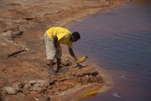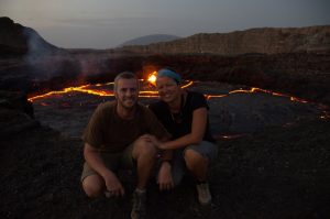 13 & 14 Nov: Since Fiona hogged the front seat all day yesterday and she had every intention of doing so again today, Becky had a little talk with her. End result was a rotation schedule. With Becky claiming the front seat today, we drove out to the nearby Asale Lake to see the Afar salt mining operation. Originally scheduled for later in our tour, Ngassi realized that the workers would be resting on that day (Friday), so he bumped up our visit so we wouldn’t miss out. We were very glad for the change as the entire salt mining area was fascinating and it would have been a real shame to miss. The Afar men working this area are very tough individuals! You’d have to be working under scorching conditions with no shade, no fresh water source other than what you carried in, and blinding white salt surrounding you for as far as the eye can see. Many of the Afar men had shaved their front teeth into a v-shape, which made for interesting portraits. Surprisingly, the men were quite willing to pose for photos, but many of them continued to work while we snapped away. The men work from dawn till dusk chipping away blocks of salt into identically sized bricks, which are then bundled up and loaded onto the awaiting camels before a trek back towards civilization. We spent about an hour at Asale Lake before reluctantly loading back up into our 4x4s for the long drive out to Erta Ale. ETT had warned us that today’s roads might be the worst on earth, taking us 6 hours to traverse 80 km. However, we didn’t find it to be too bad. At one point, Yamani got our vehicle stuck in a sandy spot, but it didn’t take long to dig us out and get us back up and running. Our lunch stop was at a place we nicknamed the “sauna box”…needless to say, it was very hot! We were sweating more liquids than we were consuming, negating the need for pee stops. After lunch, we pulled up to a military camp where two other tour groups were sitting in the shade, patiently waiting for their military escorts. Ever since the January 2012 incident where 5 European tourists were murdered near Erta Ale, the Ethiopian government has made it mandatory for military escorts to accompany every single tour group to this area. From the military camp to the base of the volcano, we had to traverse some of the most difficult terrain (jagged volcanic black rock) on the journey so far. Amazingly, not a single vehicle in our convoy had a flat tire! By 3 pm, we reached the makeshift campsite at the base of the volcano. Ngassi told us to rest for a few hours before an early dinner. After that, he said we would immediately hike up the volcano once the sun set (around 6:25 pm). By 6:30 pm, we were on the move once again, trudging up the volcano. The hike wasn’t too bad as it gently slopes up to the summit of the volcano. We took breaks every 50 minutes and before we knew it, the night view of the volcano was in the distance. It was a bit of a sweaty affair hiking up for 3 hours, but well worth it. The view was spectacular…absolutely mesmerizing. We learned that there are only 5 volcanic lava lakes in the world (Guatemala, Antarctica, Hawaii, Ethiopia, Congo), but Erta Ale in Ethiopia is the one you can get closest to. We were amazed that we could get to within meters of the edge of the lava lake. Our guides were cautioning everyone not to get too close as a fall into the rim would definitely be fatal. Everyone was happily snapping photos, although it was quite hard to capture the aura of the majestic site without personally experiencing it. Just before midnight, we were ready to call it quits, so we set up our camp site for the night (mattresses provided courtesy of ETT and lugged up via camel). It was a peaceful, open air campsite. Until several drunk tourists started chatting loudly at 2 am. Still, we slept quite well until our 5:15 am wakeup shove from Ngassi. While the view of Erta Ale at night is unforgettable, a sunrise view is just as memorable as it allowed us to experience the lava lake in different light. Very very cool. Everyone kept raving about how this was so worth the long, arduous journey. We hiked up a small hill overlooking the volcanic crater, which was pretty cool as it gave us a greater appreciation for just how massive the crater is. After that, Ngassi led us over to a nearby “dead” volcano which was quite colorful. From here, we grabbed several oranges to fuel us on the downward hike back to base camp. Interestingly, one of the other groups we ran into yesterday had already descended at about 3 am, missing the sunrise over Erta Ale. We can certainly attest that they missed out big time! Why on earth would you come all the way here and leave before the best part? The hike down the volcano took us about 2 hours and when we reached the base camp at 11 am, breakfast was spread out before us. We decided to take a quick water bottle shower in one of the empty Afar huts, but a few minutes after rinsing off, we were both sweating again (and this is during the “coldest” time of the year to visit Danakil…imagine visiting in the middle of the summer!) Afterwards, we had a long drive back to Hamad Ela with Robby sitting in the front seat. It was a very bumpy return trip and we were jostled, bumped, smashed and crowded while trying to sneak a nap in. At 3:15 pm, we stopped for a late lunch beneath a shady palm tree. Here, we had a snake like lizard visit us for some food. It had no fear as it came up to us, eagerly devouring the pasta bits we threw to it. It especially liked pasta with tomato sauce. Somehow we suspect this lizard has been exposed to humans eating lunch before. Thankfully, we only had another 45 minute drive from the lunch stop back to Hamed Ela. Here we stretched out our legs while Ngassi tried to get permission for us to revisit Lake Asale for sunset. It took thirty minutes before the military escorts gave us the green light, so we all eagerly loaded back into our vehicles for the short 20 minute drive 