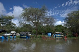 17 Nov: First order of business this morning was to hit an ATM to draw sufficient funds for the duration of our trip. We had enough US $ but wanted Ethiopian Birr as we read that banks would be limited in the Omo Valley. Just across from our hotel, we found an ATM so it took no time at all to accomplish our mission. Breakfast of eggs and bread was held in the garden, along with some fresh squeezed mango juice. With our bags packed, we were ready to go when Abenezer showed up. This morning we had opted to visit the Lake Chamo “crocodile market”, which was listed as a highlight in one of our guidebooks. Since Lake Chamo is considered part of Nechisar Park, we had to first go to the park entrance to purchase two tickets (90 Birr each plus an additional 20 Birr for our car). Then we had to drive to another office to arrange for a boat and guide tour. The price listed was per boat, regardless of how many passengers there were. It ended up being a rip off 990 Birr (for boat, guide and boatman) plus an additional 70 Birr for their return trip back to Arba Minch as we were continuing onward to the Omo Valley. Since we were responsible for their return transport back to town, we figured giving them a bit extra for a bus ride made sense. There were quite a few tourists already at the loading area of Lake Chamo, waiting to board their boats. It was obvious that the “crocodile market” is a big tourist draw in this area. We loaded up into our boat and wore the life vests (mandatory) while our boatman guided us out into the lake. Our 90 minute ride introduced us to African fish eagles, pelicans, storks, and some ducks. We saw a pod of hippos along with several crocodiles sunning themselves. Perhaps we are a bit jaded after seeing some spectacular wildlife in Botswana, but Lake Chamo did not impress, especially after our guidebook had hyped it up so much. We had expected to see hundreds of crocodiles, not a dozen or so! Overall, we would have given this a miss if we had known what to expect. It certainly wasn’t worth the expense in our minds. However, some of other tourists on the other boats were yelling in excitement at each crocodile, so maybe they felt like they got their money’s worth? Needless to say, neither our guide or our boatman received an extra “tip” for their services , and we were glad to leave Arba Minch behind as we drove south to Turmi. We didn’t get very far before we ran into a bit of a commotion on the road. A bus had run out of gas, and it was occupying both lanes of a makeshift bridge. Since this was the only way to cross the river, traffic was backed up on both sides. The driver was refusing to budge until a collection was gathered to give him enough money to buy more fuel. It was the most ridiculous scenario…the passengers on the bus had already paid their fare and they didn’t feel responsible to pay more for fuel. All other inconvenienced travelers (ourselves included) didn’t feel like we should be held hostage to the driver’s ludicrous demands. A nasty scene was brewing on the bridge as some of the more aggressive (and fed up) drivers insisted that the bus driver move his vehicle out of the way to allow traffic to continue. Eventually, the driver was convinced (either through money or might) as he grudgingly moved his bus off the bridge. During the standoff, Abenezer told us that we might have a problem with our itinerary as he had been instructed to drive back to Addis on Day 9 of our 10 day tour. Since we paid for a full 10 days with private car/driver, we refused to budge but obviously had to de-conflict the situation with Bisrat. Our first phone call was abruptly hung up on, and we followed up with text messages telling him flat out that we refused to alter our originally planned (and paid for) itinerary. After several back and forth texts, we finally got a one word answer from Bisrat, stating “OK”. Little victories! We let Bisrat explain the new situation to Abenezer and breathed a sigh of relief that this sudden suggestion of a change in plans was finally over. After a few hours on the road, we stopped at Karat-Konso to have lunch at the impressive Kanta Lodge. Our meal (goulash) was reasonably priced, and it seemed that every single tourist headed to the Omo Valley stopped here for lunch as well. Kanta Lodge certainly appears to be well established on the tourist trail, perhaps because of its affordable meals, clean bathrooms, and impressive views? The lodge itself seemed to be a popular place to overnight in Konso with its tukul style buildings (complete with thatched roofs crowned by clay pots). From Konso, we drove onward to Turmi. Konso is a UNESCO world heritage village famous for its terraced hills. We admired the cultivated hills as we zoomed on by. The other thing that caught our attention here were the skirts that every Konso woman wears (traditional hand loomed skirts with a colorful flounce around the waist). Once we crossed the Weito River, the temperature started rising. From Weita, there are two routes leading to Turmi. We assumed we would drive south towards Arbore, but Abenezer was reluctant as he said it would require a river crossing. If the river was too high (quite common during rainy season), we would have to double back to take the northern route to Turmi. So we opted for the longer route to Turmi, heading north towards Key Afer and then south past Dimeka before finally reaching Turmi. We had expressed our deep desire to see a Hamer bull jumping ceremony and Abenezer said he would make inquiries once we reached Turmi. We didn’t get there until late afternoon when we pulled into Turmi Lodge. Set on the outskirts of Turmi, this scenic lodge offered camping as a budget alternative to a room. We decided to go with the tent option, which was quite nice. A huge 4 person tent was erected in mere minutes, and mattresses with linen were provided for us. This ran us 360 Birr for the night (about $19) and the lodge came comple