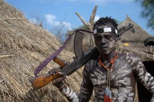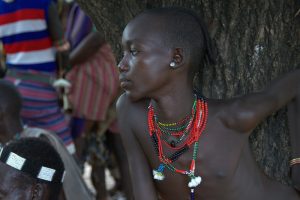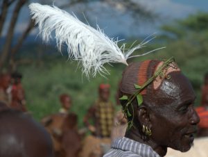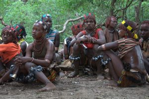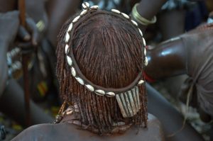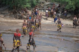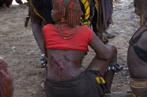 23 Nov: We were up by 7 am and ordered tomato/onion omelets for breakfast. At least the staff got our order half right as we ended up with onion omelets! After breakfast, Abenezer surprised us with some pleasant news. He told us that he had heard of a bull jumping ceremony this afternoon! Woop. We broke out in huge smiles and told him we definitely wanted to go, no matter what. First we had a detour at the Dimeka Saturday market. We arrived at around 9:30 am and it was still just getting started. Abenezer gave us about 2 hours of free time here, so we wandered around the area and quickly realized that this must be the smallest of the three markets (Turmi, Key Afar, Dimeka) we had visited on the trip thus far. We quickly scoped out the most inconspicuous vantage point, and took a seat in the shade where we hung out for the next 90 minutes observing all the market action. It was pretty cool watching as the Hamer and Banna tribes went about their shopping. Our statue seller from the Key Afar market was here, and we happily greeted him, learning that he makes the rounds of all the key markets in the Omo Valley since he is catering for tourists with his merchandise. After our fill of the market, we linked back up with Abenezer at the Tourist National Hotel (which seemed to be the meeting point for most of the tour groups). Abenezer recommended that we eat lunch (goat tibs) here first, and then depart immediately for the bull jumping ceremony afterwards. Since time was of the essence, we agreed and soon were on our way to the ceremony. Without a local Hamer guide, it would be impossible to know where to go (nothing is visible from the roadside and there is nothing indicating that a bull ceremony is in progress). Abenezer had chosen a local guide from Dimeka to accompany us. However, the ceremony was midway between Turmi and Dimeka, and this caused a dispute amongst the Hamer tribe as they wanted a Turmi guide instead. We had already driven about 45 minutes to get to the turnoff point when the argument broke out. Dismayed at the prospect of having to head back to Turmi just to get another guide, we were relieved that Abenezer kept his cool and calmly suggested some kind of compromise. The Hamer gatekeepers finally relented and we were allowed to drive inland towards the ceremony. Our 4×4 drove inland across rugged terrain for about 20 minutes before we finally parked and from here, we separated from Abenezer and followed our guide towards the event. We had to hike across a dry riverbed for about a mile, wondering where in the hell he was taking us. Eventually, we heard a cacophony of hoots, horns and bells in the distance, and knew we were heading in the right direction. A bit late to the party, we hiked up a small hill to see Hamer women begging to get whipped. A few Hamer men with switches (flexible wooden sticks) were complying, and the women’s backs were instantly raised up in bloody welts. It was shocking to see, and even more shocking that the women were actually begging for it. We had learned beforehand that all the female members of the bull jumping initiate’s family were the ones begging to be whipped as it showed their deep connection, love, and support for him during this stressful ceremony. Still, to see it first-hand…nothing prepares you for that. While the initiate’s female relatives were getting whipped, the rest of the Hamer women were singing and dancing in a circular formation, moving in a clockwise motion. It must have been a dizzying effect as they kept this up for at least 20 minutes. Once they tired themselves out, the women rested in the shade and now the Hamer men (all successful bull jumpers themselves) started up with the painting portion of the ceremony. Using natural materials to mix “paint”, the men decorated each other’s faces with careful precision. We were fascinated, and allowed to get up close for some photos…very cool! Meanwhile, the initiate hung by looking quite miserable. Not allowed to smile or show any emotion, he was butt naked save an animal skin covering. His wild hair looked unkempt, and he looked completely nervous and tense. Once the men were done painting each other, a signal was given as the entire tribe suddenly got in motion and started migrating towards the bull jumping ceremonial grounds. We had no idea where we were going but we followed suit, crossing the river bed and trudging along a narrow track through the forest for about 25 minutes. Finally, a clearing in the distance emerged and we saw the tribe break out into groups. The women separated and once again began singing, dancing, blowing horns and jumping in a circle. The female members of the initiate’s family were again begging to be whipped (their poor backs!), and the elderly Hamer men copped a squat on their stools to watch all the activity unfold. The Hamer men who had been selected as helpers stood in a loose formation around the initiate while he was being prepared for the ceremony. Eventually, the bewildered cows and bulls were herded into a compact group, and about 10 to 12 of them were selected. Manhandled to form a row, some of the cows resisted and tried to break ranks. This would send the helpers in a furious panic to catch their animal and push it back into formation. With cameras in hand, we were ready but had no idea when the actual jumping would occur. Suddenly, a naked man rushed by, and the ceremony began! The initiate (now fully naked) must jump across the backs of all the bulls and cows on 4 separate crossings. He is not allowed to fall down in the process. If he does fall down, he will not have completed the ritual ceremony indicating the successful crossover from adolescence into manhood. Initiates who fail the bull jumping ceremony must wait a year or more before they are deemed mature enough to repeat the event. Thus the enormous pressure to get it right the first time! All Hamer initiates undergo this stressful process because they want to be 