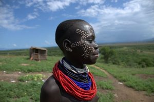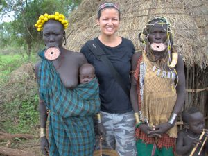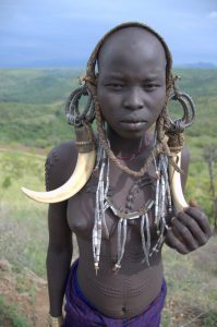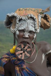 20 Nov: We were up by 7 am and headed over to have breakfast before our 8 am link up with Abenezer. However, the wait staff was taking forever to deliver our meal of scrambled eggs. When Abenezer pulled up on time, we had to tell him we were still waiting on our food. Our late breakfast pushed us back by 30 minutes, but since our only goal today was to visit the Mursi tribe, it wasn’t that big of a deal. Jinka is the base for most visits to the Mursi people, who are the biggest draw card in the Omo Valley. Famous for the clay lip plates that the Mursi women wear, most people will make a visit to Mago National Park (where the Mursi villages are) a priority. Visiting is quite pricey. We had to pay the obligatory village entrance fees (100 Birr each), but also a Mago National Park fee (180 Birr), and a “mandatory” scout for an additional 120 Birr. Our vehicle was charged 36 Birr and a mandatory guide was thrown in the mix for an extra 200 Birr. We paid for the guide but didn’t actually have one tag along as that would have meant less room in our vehicle. The mandatory “guide” was more than happy to collect a 200 Birr payout to not have to do any work! So in total, our visit to the Mursi tribe cost us a whopping 736 Birr. We had left early enough to have plenty of time to spend with the Mursi. At a picturesque lookout point, Abenezer pulled over so we could take some photos of the scenery and more importantly, some of the Mursi who were nearby waiting for the next load of tourists to pounce on. Actually, contrary to what we had been told, we didn’t find the Mursi to be overly aggressive. Each of them waited patiently as we took countless photos (the going rate was 2-3 Birr, with 5 Birr for those who modeled for multiple shots). Some of them were trading head pieces with each other, so it was a bit difficult for us to keep track of who we had photographed already. Nevertheless, the entire experience was a bit surreal. To see firsthand what a Mursi woman’s pierced and enlarged lip looks like is unforgettable. We cringed imagining the pain that the teenaged girls must go through as their bottom 2 (sometimes 4) teeth are smashed out at puberty to make room for a wooden lip plug. Once the girl can stand it, the wooden plug is substituted with a clay plug, which gets bigger and bigger as the girl’s lip stretches out more and more. A Mursi woman with a huge lip plate is considered to be highly desirable within her tribe. Interestingly, we learned that most Mursi women don’t actually walk around wearing the lip plates continuously as they are quite heavy. Instead, the plates are inserted for special occasions, or in our case, as a means to earn some money from tourists. Little did we know but our stop here was quite fortuitous. We had about two dozen Mursi men, women and children all to ourselves and there were no outside distractions. Once we showed interest in buying a clay lip plate as a souvenir, the Mursi began shoving samples for us to look at. We ended up buying 2 plates (10 Birr each) which we hoped would survive the return journey intact. A short ride beyond the lookout point brought us to Elma village (past Bella village across the Mago River). Robby tried to video with the GoPro but mistakenly put it on the wrong mode so we ended up with just a single photo of the inside of our car! Luckily Becky has asked for permission to take a video of one of the girls inserting and removing her lip disc which we found fascinating. The village was quite small, and we felt content taking as many photos as we wanted in about 30 minutes. No other tourists were here so it was quite nice taking unobstructed photos of whomever we wanted without having to worry about other tourists in the background. In addition to the lip plates, virtually all of the Mursi girls had stretched earlobe piercings, having undergone the process of ear gauging. Visiting with the Mursi was a real eye opener. We doubt that this tribe will be in existence in just a few more generations. While many teenaged girls still opt to go through the lip stretching process, some have revolted and refuse to. It’s a matter of time before this tradition dies out. Upon leaving Elma village, the village chief came out to greet and thank us for selecting his village for a visit. He told us that most tourists visit other, more popular villages but he hoped that more would come to his. Our experience with the Mursi was bittersweet. While fascinating and indelibly burned into our memories, we couldn’t help but feel extremely sad for the Mursi women who are so disfigured in a horribly painful manner. Did we regret partaking in this “human zoo” experience? No. But would we ever return for a repeat trip? Definitely not…once was more than enough. Driving back past the lookout point, we were in shock to see about 15 different 4x4s parked along the road. There must have been about 50 tourists all fighting to photograph the same Mursi people…it really felt quite insane! We were so glad that our experience was radically different as it had been just the two of us. On the drive out of Mago National Park, our mandatory scout/tracker was trying to solicit an extra tip from us. He had provided zero service other than taking up space in our vehicle. We couldn’t even communicate with him and he hadn’t contributed to our experience at all, yet here he was cheekily stating how generous tourists are and we should be too! His feelings were hurt when we dropped him off at the entrance to the national park with a thank you and a wave. Back in Jinka, we had lunch at the crowded Besha Gojo restaurant. The place was packed with different tour groups, but we managed to squeeze in while hunched over a tiny table with midget sized chairs. Our lunch of chicken stir fry was OK, cheap and filling. Abenezer gave us the option to rest or head directly to the small “South Omo Research Center & Museum” immediately after lunch. We voted on the mu