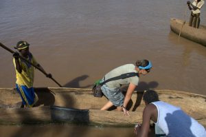 19 Nov: It was party central at the Turmi Lodge during the night. Loud music and celebratory cheers sounded until the wee hours of the morning. Of course, Robby slept right through it while Becky tossed and turned! We were up at 7 am and chose to forego the buffet breakfast, opting for a simply bowl of oatmeal and tea/coffee. After settling our bill with the lodge, we packed up our gear and were ready to go by 8 am when Abenezer pulled up. From Turmi we drove south down to Omorate village. Abenezer had cautioned us to bring our passports to register with the local officials in Omorate, a mandatory requirement for all tourists visiting this region (the town is quite close to the Kenyan border). Registration was a breeze, and we had barely parked the car before a local guide offered his services to visit the nearby Dhasanech tribe (our fees came out to 640 Birr. Breakdown of 100 Birr each for the village fee, 300 Birr for a guide, 70 Birr each for a round trip canoe ride). The Dhasanech are the poorest tribe in the Omo Valley. We were told that the women make beads from scraps of plastic and recycle bottle caps for hair weaves, but our guide told us the beaded necklaces actually hail from nearby Kenya. To get to the village, we first had to climb down a steep river bank, carefully balance our way and squat inside a dugout canoe, and hope and pray that we didn’t topple the unstable canoe during the short ride across the Omo River. A few Dhasanech teenaged girls were waiting by the riverside when we arrived, but we were more concerned about scrambling up the muddy bank unscathed than taking their photos. A short 5-10 minute stroll brought us to the village of the Dhasanech tribe. We were surprised to see that the huts here were made of a mixture of sticks and tin metal. The Omorate area is one of the hottest regions in the Omo Valley. The huts looked bloody hot in the middle of the day. But our local guide explained that while the huts are broiling hot during the day, everyone is outdoors in the fields, minding the cattle, or grinding grain. At night, the huts cool down rapidly and provide a natural air-conditioning effect. The Dhasanaech tribe is unique with their bottle cap and bullet casings headdresses. We learned that all members of the tribe endure a group castration ceremony (around aged 16), one for the girls and a separate ceremony for the boys. We singled out several of the elderly Dhasanech women to strike a pose, and one of them tracked us down at the end of our village visit to give us an enthusiastic and appreciative high five. Becky got a chance to thoroughly examine a Dhasanech man’s clay bun which is extremely intricate in design. Our guide indicated where a new road and bridge were being built to cross the Omo River, explaining that this would change the village forever after mass tourists could easily reach this remote spot. After our village visit, we crossed back over the river in the same precarious manner, and counted our blessings when we arrived safe and sound. From Omorate, we drove back to Turmi where we enjoyed lunch (lamb tibs and fried rice) at the Buska Lodge (Turmi’s other posh accommodation). We both thought the Buska Lodge looked much nicer than the Turmi Lodge. The dining areas were big thatched roof huts with a live tree growing through and serving as the center pole…very cool! After lunch we drove onward to Jinka, our base to see the most famous of all Omo tribes, the fabled Mursi. Along the way we passed by some Banna stilt walkers who looked too interesting to pass up. Easy money for those guys! Jinka was an easy drive and we pulled up before 5 pm. Abenezer recommended the Goh Hotel, a reliable budget option. The rooms were basic, but we had hot water, power, a comfortable bed complete with a mosquito net, plus a bar/restaurant. The restaurant at the hotel had a basic menu but served up massive portions of food, so we opted to eat here. Robby selected the ‘stir-fry special’ (spaghetti noodles with egg and veggies) while Becky had the traditional spaghetti with meat sauce. The beer was ice-cold so that was a bonus. The locals appeared engrossed in a B movie that was playing on the big screen. A low budget horror flick called “Dead Meat” had them squealing in horror, but we found it more humorous than scary. Satiated from dinner, we hit the room and were asleep in no time.