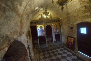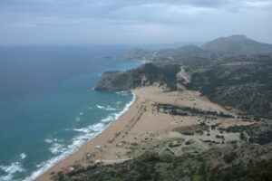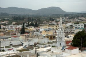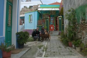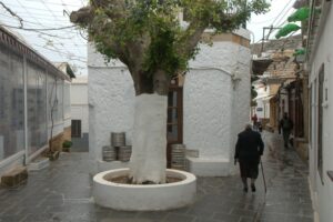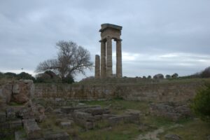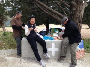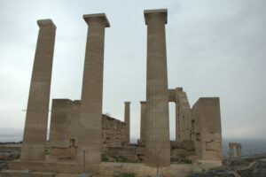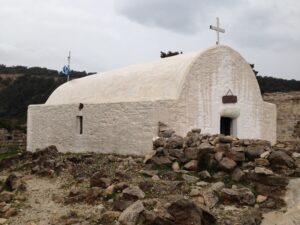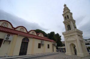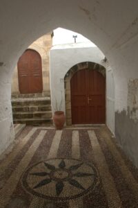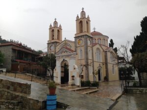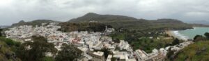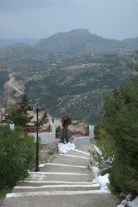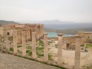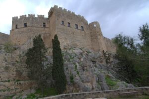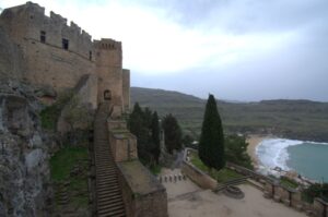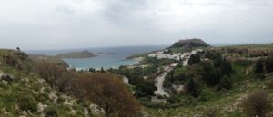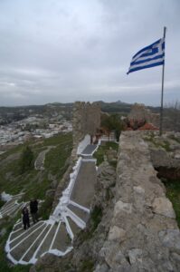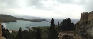 26 Mar: Goodbye beautiful old Rhodes and hello Lindos! Today we were finally leaving to explore the rest of the island. After a quick 7am breakfast, we were packed and ready to go by the time Savvas arrived. Becky settled the “bill”…we had prepaid back in November which is something Evdokia Hotel rarely does but Savvas looked back at his old records and found a receipt from several months ago, so everything was settled. At 9am sharp, our Marathon Rent-A-Car representative arrived with our car parked nearby. He took one look at our bags and sighed heavily…unsure if our compact vehicle would meet our needs (60 Euros for 2 days, all insurance included, no credit card details given with payment made in cash). Robby and Bob went with the biggest bags first to see what they could manage while we finished up some last minute packing. After thanking Savvas for his excellent hospitality and vowing to be in contact the next time we return to Rhodes, we reluctantly said goodbye. Squeezing all of our bags into a compact car was a logistical challenge but Bob and Robby were up for the task. Leaving the old city was a bit of a challenge with ongoing road work, detours, and one-way streets but we finally managed to successfully exit one of the nine pyles (main gates). A local market of fruits and vegetables just outside the walled city caught Bob and Ann’s eye, so we made a brief detour before driving onward towards Koskinou, our first stop of the day. Only 9km south of Rhodes town, we actually missed the turnoff for the traditional village so we had to continue on the main “highway” until Robby was able to do a U-turn. Our guidebook informed us that “Koskinou has been luring in camera toting tourists for years, with its traditional, neo-classical 19th century houses, many of which are painted in bright, primary colors. Most have exterior walls decorated with exquisite details in plaster or with elegant columns. An impressive portal, usually a heavy wooden door that is framed by a huge and imposing, carved stone arched surround, welcomes guests to the house.” We wandered Koskinou for a bit, admiring the architecture of the traditional houses and playing with the friendly dogs of the village. From Koskinou, we drove onward towards the coast, making our way to Kalithea Thermi, a circa 1929 Italian spa built right next to the sea. Our guidebook stated that the buildings look as if they could have been transplanted from Morocco, complete with mosaic-tiles, colonnades, and countless archways framing stunning sea views. Today, the baths are no longer in use, but visitors can visit the restored rotunda and use the facilities to swim at the nearby beach. The main dome was under renovation when we visited, but we got to check out the entire complex for free, so not a bad consolation prize. Next was a brief stop to check out Afoundou’s church tower, followed by a lunch break at Panagia Tsambika Monastery. While Bob and Ann set up our picnic, we decided to climb up the 298 clearly labeled steps to the top of the rocky promontory overlooking Rhodes’ eastern coast. Apparently on 8 September each year, female pilgrims with fertility issues will walk (or crawl on their hands and knees) from the main road up to the top of the monastery to pray for the chance of a child…no thanks! Just hiking up was enough for us, with fabulous views of the coast our reward once we reached the top. We were the only visitors to this remote monastery, and got to check out the interior of the original 17th century church and its fading frescoes. Just below us, the beautiful beach of Tsambika Bay beckoned, with its blue turquoise waters. Back at the parking lot, we enjoyed a relaxing lunch before the overly friendly goats of Tsambika came begging for food. The weather started to take a turn for the worse, so we continued on our journey to the village of Archangelos, where we had a brief stop at the ruins of the fortress. Here, we had commanding views over village but the rain started pelting us so we quickly abandoned our plans to explore Archangelos further. Instead, we drove directly to Lindos, our final destination of the day. Finding our lodging for the night, Chrysa Studios (35 Euros/night), was relatively easy. The rain started picking up, but we figured it was now or never to explore pretty Lindos so we dressed for the inclement weather and drove down to the town square (Ann’s knee was bothering her so we didn’t want to force her to hike down and back up to the apartments). Lindos is definitely the top tourist destination outside of Rhodes’ Old Town. It is a picturesque village located about 48km south of Rhodes Town, making it easy to explore the island’s top two sights. Our guidebook raved that “visiting the impossibly pretty village of Lindos with its dazzling white sugar-cube houses, dating back to the 15th century and virtually intact, climbing the hill overlooking a breathtakingly scenic bay to the cliff-top ruins of the magnificent ancient acropolis with the sanctuary of Athena Lindos, the highlight of the village, dating back to 4th century BC, literally feels like walking into a painting. It affords such glorious views that it’s no wonder that it is the most photographed village on the island. The inviting beach below, a delightful crescent of golden sand lapped by brilliant blue waters in a tranquil a horseshoe shaped bay, is a focus of millions of pictures.” If that description doesn’t make you chomp at the bit to explore Lindos, nothing else will! Down in the labyrinth old alleys of Lindos, we quickly got lost but it was nice to explore, rain and all. We checked out the one restaurant that was open (recommended by our apartment owner) but the prices were sky high as it obviously catered to tourists. None of us were keen on spending over 100 Euros for dinner, so we voted to drive around to find an open supermarket. Since it was now late afternoon, we worried that everything would be