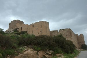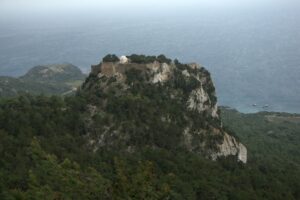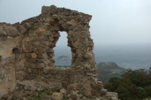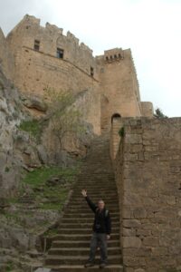 27 Mar: Lamb omelet for breakfast…yum! Unfortunately for us, the weather this morning was no improvement over yesterday but we were on a mission to check out Lindos’ Acropolis. Ann’s knee was still bothering her so she decided to skip out and Bob opted for a leisurely morning as well. So off we went, hiking down into quaint Lindos’ alleyways where we stumbled upon its ancient amphitheater before eventually finding the footpath leading up to the Acropolis. We read that the climb from the village to its famous Acropolis is steep and difficult, but honestly it was such a short and insignificant hike that we suspect the donkey taxi drivers must be writing those descriptions in order to scare tourists into renting a donkey for a ride! Rain threatened to downpour but we managed to make it to the ticket office without a drop of rain. Entrance to the Acropolis was a hefty 6 Euros each, and we were the first visitors of the day. The first thing we noticed was a relief stern of a warship carved into stone at the base of the staircase leading up to the castle. The impressive castle is the stuff of storybook dreams…it was so easy to visualize knights of yesteryear calling the imposing fortress home. Once through the portal, a heavy rain ensued. Bad timing on our part! Our consolation prize was a series of ancient monuments waiting to greet us despite the deteriorating weather conditions. These included the 342 BC columns of the Temple of Athena Lindia (built on the highest point of the rock of the Acropolis), as well as the propylaia stairway leading to a Hellenistic Stoa. The vistas from the Acropolis were second to none, despite the now serious onslaught of rain. There were fantastic views of Lindos Bay (to the north), a bird’s eye view of Lindos itself (to the west), and St Paul’s Bay (to the south). The rain was pummeling us relentlessly so we sought refuge inside the medieval headquarters building before it finally eased up for a bit, allowing us to finish our visit to the Acropolis. Back down in Lindos, we came across the town’s most interesting building, the Captain’s House Bar. The intricately carved stonework on the doorway (known as “pyliones”) lured us in, and a friendly owner gave us a brief rundown on the history of the famous building…it was well worth the purchase of a bottle of water for unlimited photo opportunities! The pebble flooring, known as “hohlaki”, consisted of black and white pebbles set into the ground in an eye-catching pattern. Two thumbs up for Captain’s House Bar…we felt lucky to have come across this hidden gem in Lindos as our guidebook hadn’t mentioned it. Bob and Ann had packed up and loaded the car by the time we reached Chrysa Studios. They were ready to start their day! We wanted to dry off a bit first before heading out, with Becky blow drying her soaking wet boots. Since we had prepaid, we left our room keys in the door and took off for the day. Our agenda was quite simple: to make our way over to Paradisi on the west coast of the island so that we would be right next to the airport for our ungodly 6:45 am flight. From Lindos, we drove towards Monolithos, making great time despite the inclement weather. The medieval fortress of Monolithos (named for the 750 foot monolith on which it is built) was an impregnable castle built by Grand Master d’Aubusson (of the Knights Hospitaller) in 1480. It was never conquered but is heavily ruined today. Inside the fortress stands the white church of Ag Panteleimon. The ramparts provide fine views overlooking the western coastline of Rhodes. We arrived just as another massive storm unleashed, dissuading Bob and Ann for a visit. Meanwhile, we braved the elements and were rewarded with a full soaking within seconds. The views were quite nice though…too bad the weather was utter crap. From Monolithos we backtracked to the mountain village of Siana, the highlight of which is its picturesque 19th century Saint Panteleimon Church, which dominates the center of the village. Torrential rain poured down…this was definitely the most powerful storm of the trip thus far. From Siana, we drove onward to our last stop of the day, the easily accessible 16th century Kritinia Castle (apparently the Knights Hospitaller loved their coastal castles to serve as lookout points, since there are quite a few castles dotted around the coastline of Rhodes). Since it was not too much of a climb from the parking lot, Bob and Ann joined us to explore the ruins of Kritinia. Built by the Knights of St John (originally on three levels), the castle ruins are definitely worth a wander. The rain continued unabated, and we were all ready to relax at our apartment in Paradisi. Thankfully, we had Google Maps as the GPS was super helpful in finding our apartment, the Old House. The owner, a pleasant older gentleman named Mike, was really friendly and super helpful. He urged us to park right outside the apartment to ease the offloading of our luggage, and offered to call Marathon Rent-A-Car to coordinate an early morning drop off at the airport (instead of tonight as we had originally arranged). He also went out to buy us two copies of the local newspaper as the interview in Rhodes was supposed to be published today…indeed, imagine our surprise when we made the front page of the news!!! His apartments were excellent, fully furnished with a full kitchen, washing machine, massive living room and spacious bedroom. Perfect for only 35 Euros a night! Old House was perfectly situated in the center of town…we were just a few minutes stroll from a massive supermarket where we bought dinner ingredients, wine and laundry detergent. The washing machines in both apartments got quite a workout as we wanted to wash all of our laundry while we had a chance. Dinner was tuna casserole (super yum) with salad, olives, cookies and ice cream…we sure were eating well in Greece thus far! Poor Robby thought it was a great idea to help Bob finis