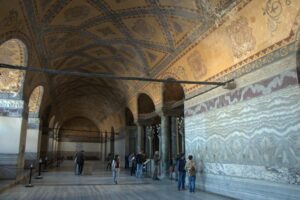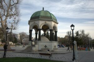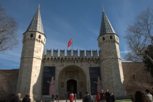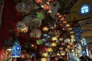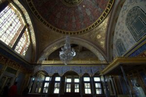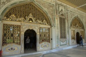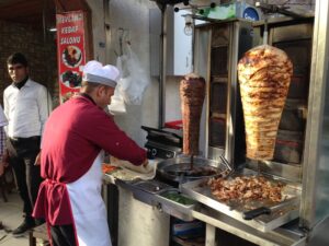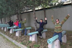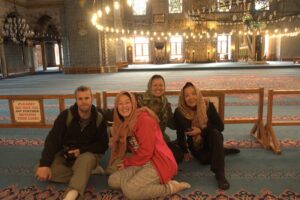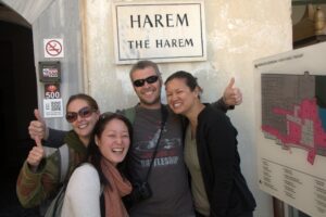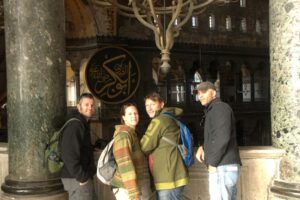 3 Apr: Since Bob and Ann were leaving us this morning, everyone woke up early for their send off. Breakfast was the first priority with leftover doner kebabs (surprisingly tasty, especially after being tossed in the microwave for a bit), fruit and coffee…breakfast of champs! After some group photos and goodbye, it was time for Bob and Ann to start their journey back home. They had contemplated catching the tram/metro back to the airport but they were dreading the uphill walk to the tram station. Instead, they walked over to the nearby Antea Palace Hotel (a best western hotel) and arranged for a taxi which was a reasonable 50TL. Robby helped them carry their luggage to the hotel, and when he got back, we all left to start our sightseeing for the day. As a group, we voted on visiting the Topaki Palace Museum first. Walking uphill towards the tram station knocked the wind out of us. From Cemberlitas, we walked towards the Sultanahmet tram stop and then onward towards the Hagia Sophia. The Topaki Palace is located to the rear of Hagia Sophia so we quickly made our way to the first courtyard. It was only 9am, and we couldn’t believe the size of the crowd that had already gathered at the ticket machines. Since we had a few days to sightsee Istanbul, Bob and Ann had advised that we should buy the 3 day, 85 TL Museum Pass. This would grant us access to the Hagia Sophia, Topkapi Palace, Mosaic Museum, Archaeological Museum, and Hagia Irene. The ticket line, while long, was moving quickly and before we knew it, we were in front of the credit card only machines with a total wait time of about 15 minutes. Getting our Museum Passes was a breeze, and we quickly headed towards the main entrance to the second courtyard of the Topaki Palace via the Babüsselam Gate. After swiping our museum passes and going through the scanner, we were standing in the second courtyard of the massive palace complex. Since the Harem was included in our museum pass and it is insanely popular, we decided to pay a visit here first. The Harem section of the palace essentially functioned as a labyrinth of over 400 private apartments built to accommodate the Sultan’s wives, concubines, eunuchs, servants, slaves, and female relatives. Out of the 400 apartments, only a handful are open to the visiting public and we visited magnificently tiled rooms with the following descriptions “Hall of the Ablution Fountain”, “Concubines Corridor”, “Apartments of the Queen Mother”, “Imperial Hall” (the most impressive of all the rooms we visited!). Interestingly, since Islam forbade the enslaving of Muslims, the majority of the harem women were Christians or Jews who were given as “gifts” to the Sultan, and forced to convert to Islam. Their “training” included learning to read/write, play a musical instrument, sing, dance and provide pleasure to the Sultan. The harem section of the palace was definitely a worthwhile visit as the other areas of Topaki Palace paled in comparison. We exited the Harem and ended up in the third courtyard of the Palace. From here, we strolled to the fourth courtyard where we checked out the pool and Baghdad Pavilion. Next we tried to visit the chamber of sacred relics and the treasury but there were hundreds of Turkish school kids who were cutting the insanely long line and pushing to get close to the relics. We didn’t enjoy the chaotic scrum so after a quick glance of the jewels, we quickly exited to get away from the madness. After making our way back to the second courtyard, we visited the imperial council, clocks section and palace kitchens before all agreeing that we were “museumed” out. It was around noon time and we were hungry, so lunch it was. Bob and Ann had discovered and recommended a local joint called “Degirmencioglu” in the Sultanahmet area that served up cheap and tasty meals. We were able to make our way through the back alleys to find this hidden gem. Everyone was thrilled with the huge selection combined with the great value of the hot meals. After stuffing ourselves for lunch, we slowly strolled back towards our apartment with an afternoon siesta in mind. Along the way, we made a quick detour at the Sultan Mahmut II mausoleum and cemetery. Unfortunately, the mausoleum was closed for lunch so we decided to visit again later. Next task was to do some grocery shopping at a nearby supermarket where we stockpiled necessities for the next few days: snacks, beverages, food. Kendra was on a quest to find pomegranates for a cocktail she had invented, while Robby was on the hunt for a knife. After acquiring everything on our shopping list, we returned to the apartment for an afternoon snooze. Post nap, we decided to do a bit more sightseeing and walked over to the nearby Grand Bazaar. While no one had any shopping intentions, we figured we could see what all the hype was about. Since the bazaar was quite labyrinth like, we decided to split up and rally back at Gate #2 in just under an hour, giving us plenty of time to explore. The bazaar was nothing like we remembered it being over 15 years ago…a lot tamer with less aggressive salesmen. The interior was quite photogenic and we went a bit mad taking photos. The highlight of our visit was a stop for apple tea. For dinner, we stopped by a roadside stand selling lamb sandwiches. The smell of onions and lamb sautéing lured us in and everyone was satisfied with their tasty 4TL meals. George wanted to buy some water from a neighborhood store. When he emerged, not only did he have a 10L water bottle but a massive donut shaped bread…only George! It was a chill night back at the apartment as we started drinking, got Robby super drunk, put Robby to bed only to have him pop back downstairs feeling 100% better after a quick vomit and start drinking again! George and Kendra taught us a couple of drinking games, resulting in a fun night.