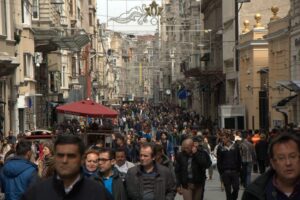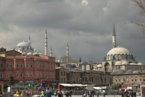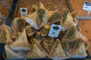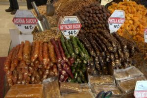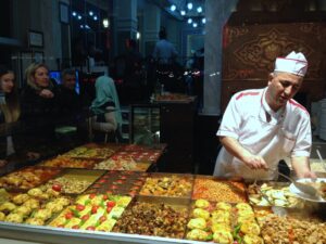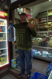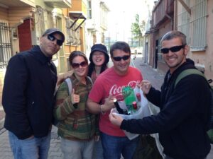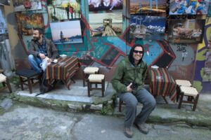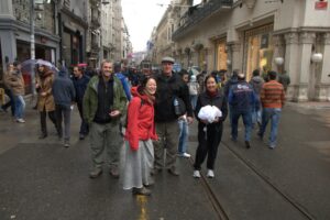 2 Apr: Bob got up early to make coffee and discovered the water boiler was inoperable. However, we did have a hot plate that was functional so crisis averted. After our self catered breakfast, we decided to head out as a group to the spice market area. Bob and Ann told us that the adjacent New Mosque (circa 1597) was better than the Blue Mosque, and with far fewer tourists so we decided to check it out before browsing the spice market. Walking from our apartment to the Cemberlitas stop so we could catch a tram in the direction of Kabatas was hard work as it was straight uphill! We eventually made it, caught our breath and a few stops later hopped off at Eminonu. The New Mosque (free) was magnificent. There weren’t any other tourists in sight, and we were quite impressed with the stunning architecture. Plastic baggies were provided for our shoes (mandatory to remove shoes prior to entering the mosque), and we brought our own scarves (also mandatory for women). We spent a few minutes here in admiration…definitely a worthwhile stop if visiting the Spice Bazaar! We knew that we were likely to get split up at our next stop (spice market), so we agreed to meet up again in 45 minutes in front of the mosque. The spice market (also known as the “Egyptian Bazaar”) was full of stores selling spices, dried fruit, nuts, tea, Turkish delight, and souvenirs. We weren’t hassled as much as we had anticipated and our time here went by quickly. Dates from Tunisia were the best bargain…we got 1kg for 5TL. After linking back up with Bob and Ann, we decided to hop back on the tram all the way to Kabatas, where we caught the funicular to Taksim (a two station underground line). Taksim Square is the heart of the European side of Istanbul. The area is replete with restaurants and shops. We calculated on having enough time for lunch, as well as a stroll from Taksim back down towards the Karakoy tram stop, before having to go back to our apartment to meet up with Kendra and George (who were flying in later today!). Lunch was at a local cafeteria. Basically, the process is quite simple…grab a tray and utensils, point out any dishes that might tempt you to the server. The server in turn plops the food out on a plate, hands it back to you as you shuffle down past the dessert and drink bar area and pay at the cashier…very simple, fast and efficient. All five of us had piping hot food in no time at all, and we found a free table upstairs. Our meals (beef and a chicken baked dish with veggies, mashed potatoes and cheese) were tasty and affordable…much better value than the dinner meal we had in Sultanahmet last night. After lunch, we walked down the full length of Istiklal Avenue (about 1.5km). This pedestrian street was packed with people despite the light drizzle of rain. It was funny watching the tram as it chugged along Istiklal…it was like watching the red sea part with pedestrians scrambling to get out of its way. The weather improved as we made our way towards Galata Tower. The sun came out, and the streets got even busier. We hopped on a tram back to Cemberlitas as we weren’t sure what time Kendra and George would arrive. Plus we wanted to ensure that the apartment issues had been resolved. Rather disappointingly, no one had showed up to fix the broken toilet so we had to call Kadir to complain. He showed up in person with Ramsey who served as his personal translator. At first, Kadir tried to get out of repairing the toilet, stating that the details on AirBnB were wrong and we would have to make do with only one bathroom but Robby wasn’t having any of it. He insisted that one toilet shared amongst 8 guests was not going to cut it and demanded resolution. Kadir feebly tried to protest before he finally caved…he hired a plumber on the spot to fix the broken toilet. He also saw that lighting was inadequate in the basement so he had Ramsey bring us over a lamp and a new water boiler. And we got an extra set of apartment keys. Things were finally improving. The plumber had to go back and forth to get necessary parts to fix the toilet but things were looking promising. Kendra and George finally showed up (yay!) with bottles of duty free alcohol which we quickly tore into. It was awesome seeing them again. The plumber finally fixed the toilet and life was good. Becky had to do a bit of housekeeping in the second bathroom as it was quite filthy, obviously not having been in use for several months. After much effort, we finally had a fully functional apartment for 8 guests, and we were satisfied that all of our concerns had been addressed. After a few drinks, Bob, George and Robby decided to head out to a nearby kebab stand to grab dinner for the group (10 kebabs for 65 TL). As they were stumbling about noisily outside, who did they run into but none other than Francisco! The group was now complete…everyone made it to the apartment successfully and we greeted Francisco with a kebab in one hand and a drink in another. Welcome to Istanbul, bitch! After several rounds of drinks, Francisco eventually grabbed a spare bed downstairs next to Ichiyo while George and Kendra crashed in our room for the night. It was a fun reunion and we were looking forward to the next few days.