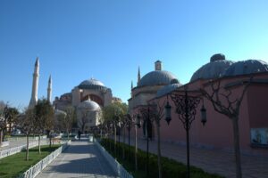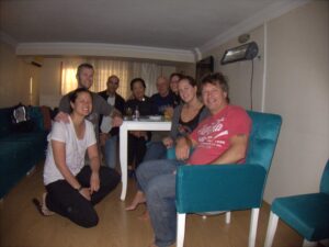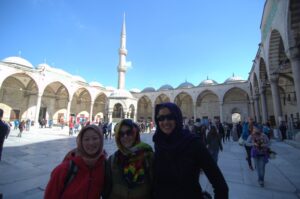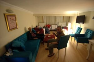 1 Apr: Our flight from Athens to Istanbul on Aegean air was smooth, with an on time arrival just after 3pm. Passport control was a chaotic mess. We spotted another passport control station in a different part of the airport and figured we could bypass the massive queue since no one was in line there. And for good reason…apparently the arbitrary officials at the second passport control station would only accept passports from African nations! Go figure. So back we went to the original passport control area where, thankfully, the line was moving fairly quickly. After getting stamped back into Turkey, we retrieved our sole check-in bag and decided to take advantage of duty free, maxxing out our alcohol allowance. Since we were now pros at catching public transportation from the airport to Sultanahmet, we made our way to the metro for the ride over to the tram station. From there, we hopped on a tram that took us to Çemberlitas. Becky had booked an 8 person apartment on AirBnB in the Sultanahmet area of Istanbul, and Bob and Ann had already reconnoitered the route to get there. Fortunately, it was all downhill from the tram stop which was lucky for us as our luggage felt quite heavy with all the liters of alcohol. Even though Becky had provided an arrival time to Kadir (apartment owner), there was no one to let us in upon arrival. A helpful shopkeeper down the street knew Kadir and volunteered to call him on his cell phone. About 15 minutes later, a young guy named Ramsey came strolling over to let us in. Our apartment, appropriately named “Black House Apartments” (the only black painted house on the street), was conveniently located in a residential neighborhood of Sultanahmet next to a school. To our dismay, we discovered that the apartment had a rather musky smell. It hit us the moment we walked inside. Even though it was obvious that the sheets had been recently changed, no other housekeeping was evident as the place was in desperate need of a good scrub down. As Becky opened the windows to air the place out, the neighborhood cats seized the opportunity to climb inside! No wonder cat hair was strewn about everywhere…with Robby being deathly allergic to cats, we immediately shooed them out. Other immediate problems were that Ramsey had only provided one set of keys, and we needed at least two sets with our soon to be growing group. Additionally, even though we had been promised two working bathrooms, one toilet did not flush and a previous inhabitant had left us a very disgusting present! It was not the best first impression, to be sure! Minor issues like poor lighting and an inoperable water boiler were also on our “must rectify” list with Kadir. Ramsey promised to return with an extra set of keys in an hour, and he said that the toilet would be fixed tomorrow. He soon returned with Ichiyo in tow…she had just arrived from her flight from Japan!!! It was so awesome to see her, and we were thrilled that she had no problems finding the apartment with our directions. We had a welcome drink or two and sat around getting caught up. Ichiyo was planning on taking a few months off to travel around the world, and luckily for us had made Istanbul her first destination! After a while, Bob and Ann volunteered to wait for Ramsey to return with an extra set of keys while the rest of us decided to go find some dinner. Apparently, Sultanahmet is not the place to be for affordable cuisine! The entire district obviously caters to tourists with its inflated prices and bland food. We found a nearby restaurant that looked appealing but none of us were impressed with our dinner. Ann and Bob happened upon us in their quest for Chinese food, telling us that Ramsey never showed up with the keys. Disappointing news. We wandered around Sultanahmet when the skies opened up on us and started to pour heavy rain. The kind staff at our restaurant gave us an umbrella to borrow…how sweet! Our quest to find air freshener, fruit for breakfast, drinkable water and toilet paper while stumbling around Sultanahmet in the dark was quite an adventure. With rain pouring down and soaking us, we tried our best to avoid puddles as we wandered around. Despite the late hour, we were able to find almost everything on our shopping list. Back at the apartment, the air freshener made a huge difference to combat the malodorous smell of the apartment. Poor Ichi was exhausted after her long flight, so we bid her goodnight and left her alone for a good night’s sleep.