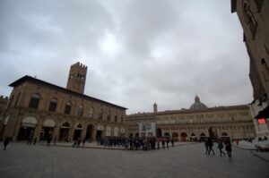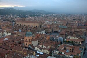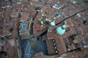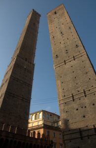 From Palazzo dell’Archiginnasio, we walked over to the Basilica di Santo Stefano complex, also known as Sette Chiese (Seven Churches). It is one of Bologna’s most unique sites because the 7 Churches are interlocked and embedded within each other in a labyrinth layout. From Piazza Santo Stefano, only the façade of three of the churches are visible. We decided to save our visit to Santo Stefano Basilica for tomorrow, so we continued on to the main symbol of Bologna, the two towers. Apparently Pisa isn’t the only Italian city to have a leaning tower, as the Tower of the Garisenda has a definite lean to it. We happily paid the 3 Euro fee to climb the 498 steps leading up to the top of the Tower of Asinelli for a fine panorama overlooking Bologna. The timing was just right, as we arrived just before sunset. It was dark when we decided to head back down, and there were still visitors climbing up the stairs for a view of Bologna’s skyline!