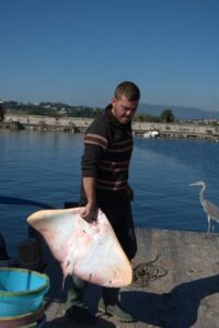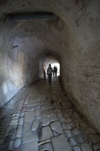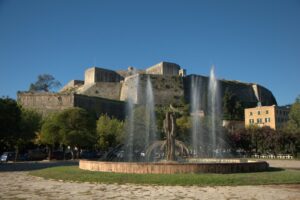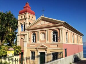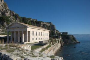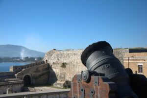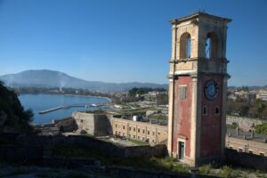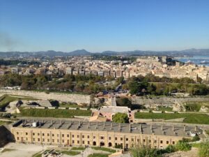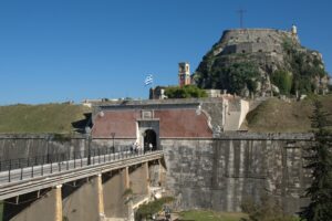 Our first stop was a visit to Áyios Spyrídon (Saint Spyridon) Church, a Greek Orthodox Church in the old town. The bell tower served as a beacon and we easily found our way there. Next up was a brief stop to admire the exterior of the Old Royal Palace of St Michael & St George (today the Museum of Asian Art) on the Esplanade (Spianada). The Esplanade is the large park serving as a buffer between the Old Fortress and Corfu town. Apparently it’s the largest square in Greece! Next up was a visit to the Old Fortress. We had briefly debated which fortress we wanted to visit (old or new) because visiting both would definitely make us all “fortressed” out. The Old Fortress won, simply because we thought the sun was more ideally situated for us to take photos looking back into the Old Town, rather than shooting directly into the sun from the New Fortress. Entrance fee to the Old Fortress was 4 Euros each, and it was well worth it for the views alone. We had to cross a moat to get to the Fortress (it is separated from the rest of the town by moat), and we spent several hours here admiring the vistas, checking out the museum displays and hiking up to the lighthouse. We learned that the Old Fortress was built by the Venetians in 1546 on the site of an earlier Byzantine Castle. Corfu gets its name from the Old Fortresses’ two heights, or korypha (“peaks”). From these peaks, there are phenomenal views looking west over the town of Corfu. This is definitely one of Corfu’s “must see” attractions.