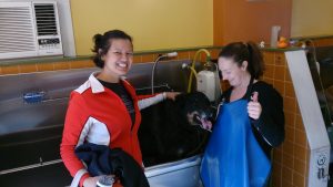 Becky and Becca give Duke a bath at Laundramutt; Boston, MA