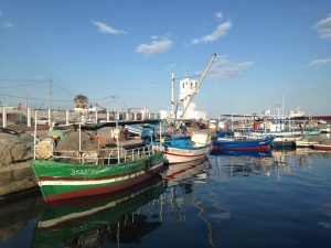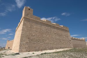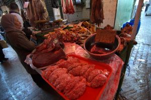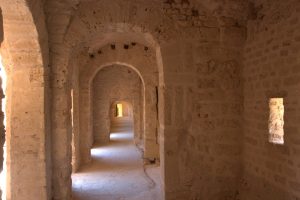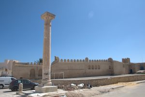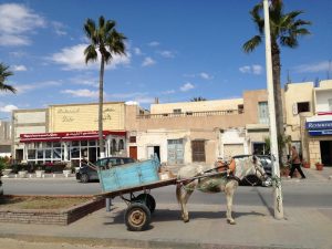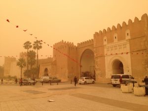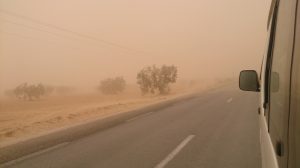 The weather grew worse as the day wore on with visibility severely restricted. At the town of Medenine we saw a horrible accident involving an SUV that had been crushed. Today was not the day to speed considering how horrible the wind and sand storm was. Our louage had set off at 10 am and it took a lot longer than we had anticipated to reach Sfax because of the numerous police checkpoints where everyone’s identification cards were collected by the driver and scrutinized by the police. We rolled into Sfax by 2:45 pm and were happy to finally get here. Thanks to google maps, finding our way to the medina was a breeze, and we checked into the first hotel we stumbled upon, the Hotel Medina. One of the friendly staff spoke good English and he offered to show us the rooms first before we made up our minds. At a price of 15 Dinar a night for the both of us, we quickly picked out a room and opted to pay an extra 1 Dinar each for a hot shower….17 Dinar to stay in the heart of the medina. What a bargain! The wind was blowing sand and dirt particles furiously which put a damper on our sightseeing. We did brave the elements for a few photos with our phones (no moving parts) but after being constantly pummeled by sand, we finally decided to call it quits and have an early dinner (rotisserie chicken, chips and salad for $3 each). Our hot water showers made us feel human again and we spent the rest of the night in our room enjoying the respite from the sand storm.