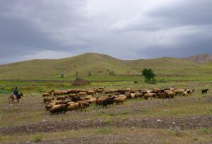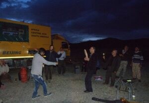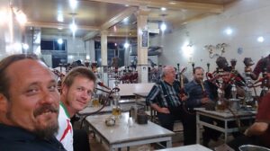 Lunch was just down the road in an empty lot where we waited to meet our mandatory Iran guide who was to escort us throughout our entire time in the country. He finally showed up and we were introduced to Hossein, a good looking young guy who specializes in motorcycle tours. It was music to our ears to hear that the men could wear short sleeves and flip-flops. Women could also wear flip-flops but they had to stay covered up at all times other than inside our hotel rooms. Hossein then escorted us to our first bush camp near Marand. After setting up our tents locals started to show up on motorcycle and by the truck load to say hello. The circus was in town! Even the shepherds minding their huge flocks of sheep and goat came in for a closer look. After dinner, two locals provided some impromptu entertainment with a tambourine and traditional type of guitar like instrument. He sang the first few rounds and was keen on us to start dancing for him, but no one was really game. It was all a bit too surreal being surrounded by locals filming us on their cell phones and demanding that we perform for them. Dance monkey, dance! The ladies had the perfect excuse since we had been told local women don’t perform in front of large groups of men. But the guys were free game, and after relentless pressure, Robby, Andy and Anthony reluctantly gave it a go much to the merriment of the locals. Poor Kyle was the last guy singled out and he wasn’t having any of it. After adamantly refusing several times, the locals finally dragged him out to the center of the makeshift circle but Kyle escaped as soon as possible. Thankfully the locals caught the hint when we started packing up the kitchen around 10 pm and they quickly said their goodbyes before leaving us in peace. Welcome to Iran!