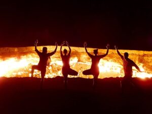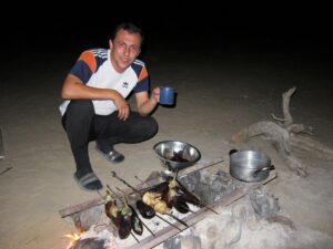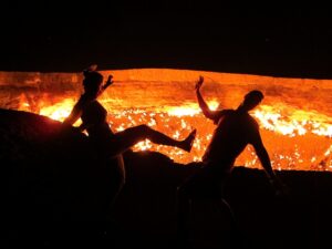 06 Jun – Robby’s cook group (Robby, Andy and Kate) had to go shopping at the bazaar after breakfast. We were supposed to leave Ashgabat at 11 am but getting everyone’s passports registered took a lot longer than anticipated so it was closer to noon by the time we finally left for the Darvaza craters. The drive north was hot and dusty and seemed to take ages. Maksat explained Darvaza actually consists of 3 craters (water, mud, and gas) and we visited them in that order. The first 2 were easy to get to, but the gas crater was off road and based on last year’s experience, Kate/Kyle were worried about getting the truck stuck in sand. Last year took 4 arduous hours of sand-matting to get the truck to the gas crater and we were NOT looking forward to a similar experience. The first route we took was a bust as the shepherds strongly advised us against proceeding further ahead, guaranteeing that the truck would get stuck. Kyle turned the truck around but was unable to get back up the hill without a tow, so we had to wait patiently for Kate to coordinate a solution. Daniel had a meltdown experience on Dya, yelling at her when she asked him to close the door prior to Kyle driving the truck uphill. He was completely out of line and made himself look like an ass in front of everyone. Kate finally showed up with a ruggedized 4×4 truck that was able to pull us back onto the tarmac. It also led us along an alternate route to the gas crater, and amazingly, Kyle managed to drive the entire way without assistance. Seeing the gas crater at 9:30 pm was a surreal sight…amazing, phenomenal, the superlatives are unable to accurately describe the sight, sound and smell. It was well worth the extreme effort to get here despite the late hour. Cook group had dinner prepared at 11 pm so it was a late one. Maksat assisted by grilling eggplant over his own camp fire for a special dish. Weird spiders with large pinching legs were attracted by the light, and they looked like alien creatures in a horror film, freaking us out. At midnight, we trudged back down to the gas crater and took lots of silly group photos…it was great having the place to ourselves. Due to the toxic fumes emanating from the gas crater, camping by the rim is strongly discouraged so we had to settle for being about 300 meters away. Close enough to admire it from a distance.