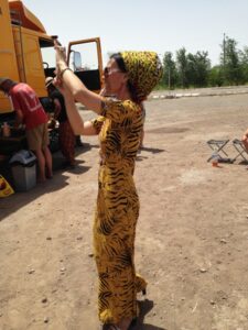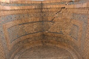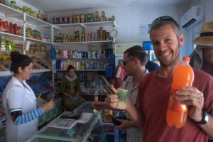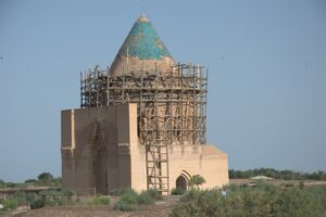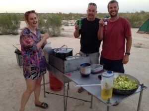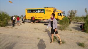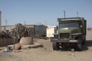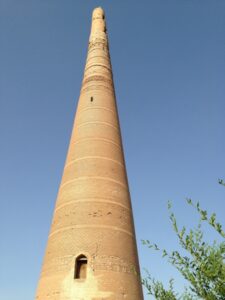 07 Jun – Kate recommended that we wake up and depart at 6:30 am, so that if the truck got stuck, we could sand-mat before it got too hot. Luckily, we had no problems leaving the gas crater thanks to Kyle’s skillful driving. Once on tarmac, we stopped for a quick breakfast and then drove north towards Konye Urgench. The drive was uneventful but at our roadside lunch stop, Dya bought an embroidered collar that the women wear on their traditional dresses. A curious Turkmen woman brought her son over to our lunch area and asked if she could take photos of us. We happily obliged. It was interesting that she felt comfortable enough in a police state to stray outside of what is considered normal behavior. We learned that Turkmenistan is on par with South Korea and Eritrea in terms of tightly controlling its populace, so the level of paranoia here is understandably high. It was refreshing to have someone here show curiosity and act upon it, instead of suppressing that natural urge. By mid afternoon we reached Konye Urgench and Maksat told us how we could see most of the sights without having to pay for an overpriced ticket. The 11th century minaret was the most impressive of Konye’s sights, and it didn’t take us long to see everything. Kyle went to fill the truck with gas while we were busy sightseeing and because of the heat, most of us were ready to go before he got back. Kate and Kyle took mercy on us and stopped at a store where we could get cold drinks and ice-cream to cool down before we drove off to our final Turkmenistan bush camp. Robby, Kate and Andy prepared veggie stew with buckwheat for dinner, while SCUBA Gill made bread pudding. Bjorn was keen on a camp fire, so we lounged around for a bit after it got dark chatting it up with everyone. Helen asked everyone to contribute to a tip for Maksat for his excellent service over the past few days and we happily gave our portion. Without a doubt, our Turkmenistan experience would have been completely different without Maksat as our local tour guide.