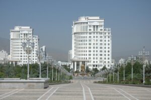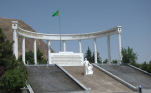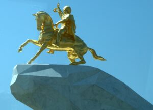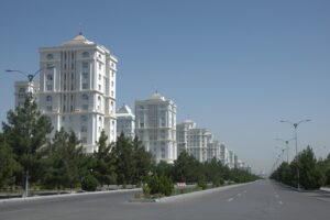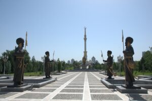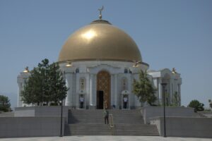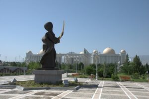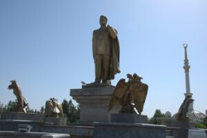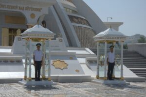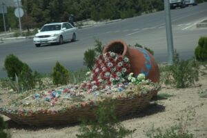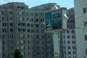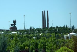 Our hotel in Ashgabat was at the very comfortable Ak Altyn Hotel. The pool quickly lured us in and we spent the afternoon getting quite tipsy in the sun – not a hard feat considering none of us has had a drop of alcohol in the past few weeks of Iran. Vodka is dirt cheap here – a 0.5 liter bottle costs a mere 9 Manat or about $2. Bargain. Our Turkmen guide, Maksat, has been phenomenal. He led us on a city tour of Ashgabat where we got to meet this city of marble up close and personal. Security forces and police are seemingly on every corner of this glistening city, and we were forewarned that our hotel rooms would be bugged (the first thing we wanted to do after hearing that was to play a porno on full blast). It is forbidden to talk disparagingly of the ex-President (Saparmurad Niyazov aka “Turkmenbashi”) even though he passed away in 2006. No doubt about it…Turkmenistan is a tightly controlled police state.