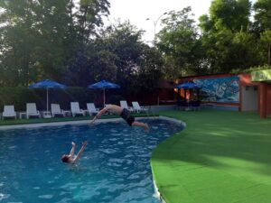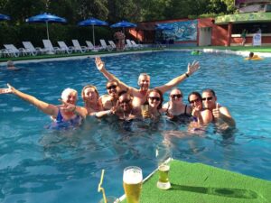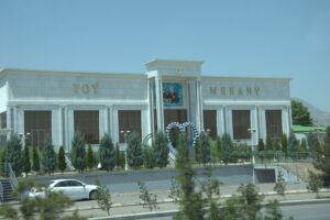 The drive to Ashgabat was unforgettable. A shimmering white marble city visible from miles away. However, the excellent highway and immaculate wide streets were totally devoid of vehicles and pedestrians…totally surreal! We felt as if we were in the middle of a movie set…there is no other capital city in the world as unique as Ashgabat. Our hotel for the next two nights was the excellent 4 star Ak Altyn Hotel, complete with a swimming pool! Happy times. We had been warned that Turkmenistan is a tightly controlled police state and that our hotel rooms would definitely be bugged. Our first priority after checking in was to get some cheap alcohol. Since we were adjacent to the Turkmen State Circus, Maksat pointed us to a nearby store where we got cheap vodka (½ liter of bottle for $1.50). Then it was straight to the pool with our drinks. A fun few hours ensued and at 7 pm, we tore ourselves away to join the group for a welcome dinner. Maksat led us to the Berk Restaurant (used to be listed as “Iceberg” in the Lonely Planet) and helped over 20 of us order our meals. Shockingly, pork is served in Turkmenistan (its a Muslim country), so we ordered pork ribs and kebabs…delicious. Poor Maksat also helped settle the dinner bill which was a horrible ordeal for him considering we all wanted to pay individually. During dinner, Lars and Ichiyo were invited for shots with a guy celebrating his birthday and they both got completely smashed. Ichiyo was fine after puking right outside the restaurant, but Lars was out of control. Kate was busy helping him out and we managed to get him to his room and into his bed after tricking him into drinking a bit of water (its vodka Lars, drink up). 15 minutes later, he showed up at the Kaktus bar on the dance floor and we knew it was gonna be a long night! Helen took mercy on Lars looking forlornly at all the couples slow dancing together and was rewarded with a swing dancing session. Pretty soon the party moved to the downstairs disco and Lars showed off his drunk dance moves much to the chagrin on the concerned bouncer. Great first night in Turkmenistan!