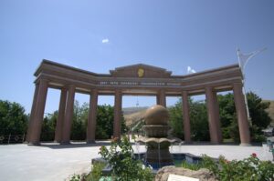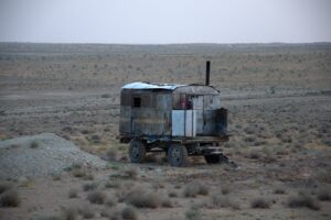 04 Jun – Kate had us at the Bajgiran border crossing an hour before it opened. Getting out of Iran was super smooth and thanks to a friendly Turkmen General, getting stamped into Turkmenistan was a breeze ($55 visa fee and $10 service charge, cash only). The Turkmen women at the border crossing were wearing the most beautiful traditional outfits, with embroidered dresses and large pillbox style head-wear. ..phenomenal. Too bad we weren’t allowed to take photos at the border because the women looked amazing. Our guide, Maksat, met us at the border. He instantly impressed us by taking charge and leading us directly to a suitable area for our truck lunch, which was past a 30 km restricted buffer zone (no photos or stopping allowed in this area, highly tempting because there were tons of ibex on the hillside). Kate asked for volunteers to help clean out the 3 spare tents to prepare them for the newbies joining us in Ashgabat so we helped out. During lunch, Maksat gave us his contact information (in case we got hassled by the police) and a briefing on Ashgabat. We really loved having a local tell us the best places to score cheap alcohol and good food. We liked Maksat instantly and were thrilled to have him as our guide.