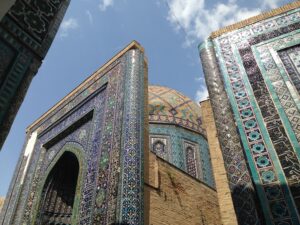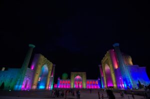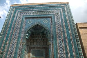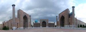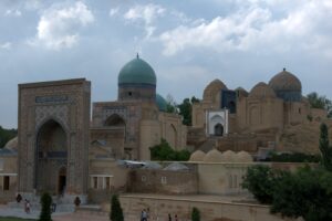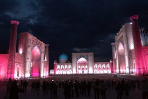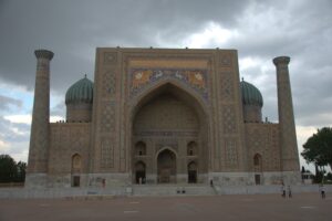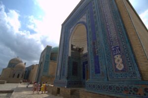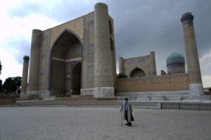 15 Jun – Today we had a break from Habibi! We were going to catch a train from Bukhara to Samarkand. Since we didn’t have much time for breakfast, we grabbed a couple of items to go for a makeshift breakfast on the truck. Kyle dropped us all off at the train station and after getting our bags scanned, we boarded our train and got settled into our compartments. Robby was in a section with Connie, Chris and Ant, along with two locals. One of the locals, Sascha, was a lively old fellow who couldn’t speak a lick of English but he made himself understood. He had a bottomless bag from which he pulled out food and proceeded to make a hot cup of tea for everyone. A traumatized Chris recounted a story of how he was sitting there playing his video game one minute, and the next minute he had a heart attack when Sascha blew a whistle into his ear for some reason and startled him silly. It was pretty comical and sounded like an interesting compartment to be stuck in. Kate had prepared little goodie bags for everyone so we stuffed ourselves and quickly got a sugar high. Before we knew it, we were in Samarkand. Kate had organized for a bus to take us to the Asia Samarkand Hotel. After checking in, we went out for a walk right away to take advantage of the afternoon light. We strolled past Bibi-Khanym Mosque and Bibi-Khanym Mausoleum to Hazrat-Hizr Mosque. From there we walked through the cemetery to Shah-i Zinda (fabulous…definitely a must see in Samarkand). Then it was a short walk back to Bibi-Khanym Mosque, but honestly, that could have been a miss since it was underwhelming. After running into Michael and Ben, we traded tickets with them so they could check out Bibi-Khanym without paying and in turn, they gave us their tickets to the Registan so we could check it out later for free! Kyle had arrived to Samarkand by that point, so we headed back to the hotel to grab our gear off the truck. Then we head out to check out the Registan and it was as nice as we remembered on our first trip to Uzbekistan back in June 2003. Dinner was a Lonely Planet recommendation and boy should we learn our lesson from this experience! We ate at Café Labig’or near Registan and it was horrible. The food was not good and it ended up being our most expensive meal thus far in Uzbekistan!! Lesson learned…avoid LP recommendations like the plague! The Registan had a sound and light show (free) which was quite nice. A local Uzbek family befriended us and kept insisting we accompany them back to their home. We didn’t want to impose so we kept declining politely and eventually made our way back to the hotel.