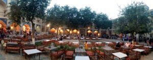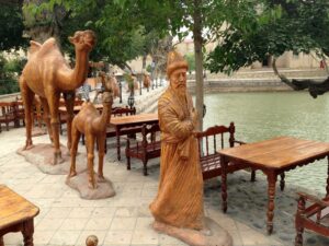 13 Jun – Up early for breakfast so it was only 8 am when we pulled out of camp and drove towards Bukhara. After a couple of hours, we pulled into the centrally located Asia Hotel Bukhara and had a truck lunch in the parking lot around noon. After checking in, we cooled off with a shower and got rid of all the sand from last night…bliss! The pool was calling so we hopped in to cool down and then got ready to join the gang for a group dinner. Our plan was to eat at a local joint that offered a fashion show. Unfortunately, since we were in the low season, the next show was scheduled for tomorrow so we gave it a miss and walked over to the nearby Labi Hovuz Square. Dinner was OK (the restaurant is better known for its atmosphere rather than its food) but the wind started kicking up and blowing sand in our faces. It was unbearable to get constantly pelted by particles of dirt and grime so we cut our meal short and abruptly left the group. It was a bit too early to head back to the hotel so we killed some time by sightseeing around Labi Hovus Square (Hoja Nasruddin, Nadir Divanbegi Medressa) before finally retreating to our comfy room.