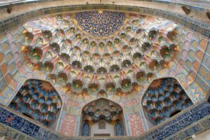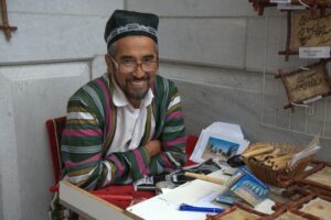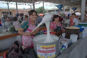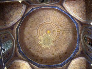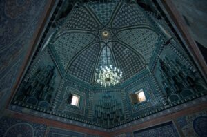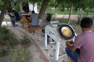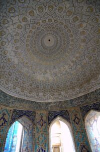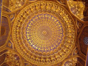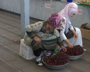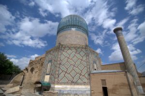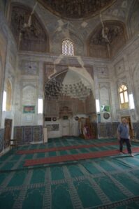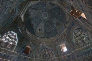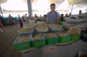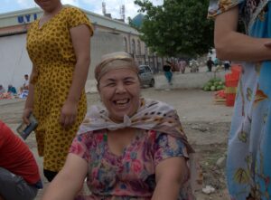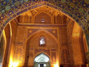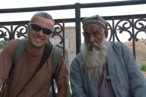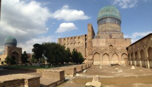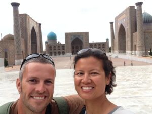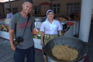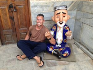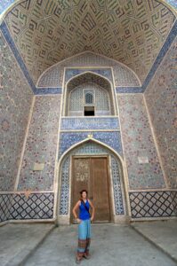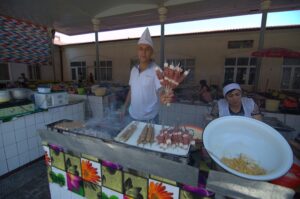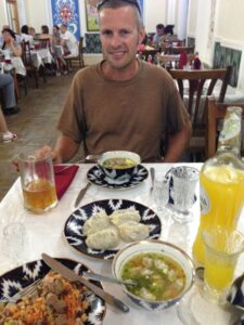 16 Jun – After getting up early for breakfast, we chilled in the room until 9 am. Today’s sightseeing tour was a walking tour of everything we missed seeing yesterday. After checking out the Registan in the morning light, we walked over to the Statue of Amir Timur. Then it was onward to the Gur-E-Amir Mausoleum which was quite impressive. Robby had figured out how to bypass the ticket booth (simply walk to the back of the mausoleum and you can stroll in for free). Afterwards, we visited the lively bazaar where Robby was able to exchange more money on the black market for a favorable exchange rate. We were given free samples of apricots stuffed with walnuts and raisins, and of course had to by some. Uzbeks are extremely friendly and photogenic, and everyone seemed quite happy to pose for photos. One of the street vendors was selling fruit, and she had a grill of gold teeth. After smiling beautifully for the camera, she insisted on giving us a bag of plums for free…they were delicious! Probably the sweetest yellow plums we’ve ever tasted. She repeatedly invited us to her home and we had to decline several times before she accepted our decision. Next up was the Jewish quarter which didn’t appear to be noteworthy so we decided to have lunch near Bibi-Khanym Mosque at the Bibi-Khanym Chaikhana (excellent grilled kebabs). After relaxing at the hotel for a few hours, we decided to return back to the chaikhana for dinner which brought a huge smile to our waiter’s face when he saw us.