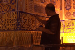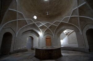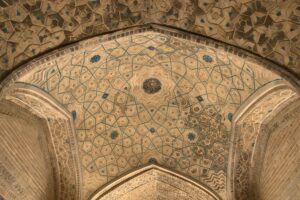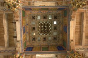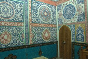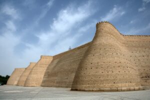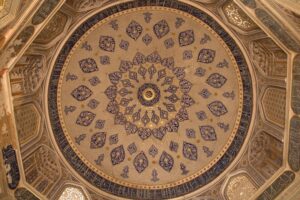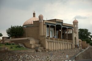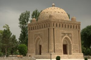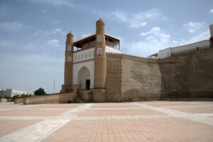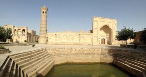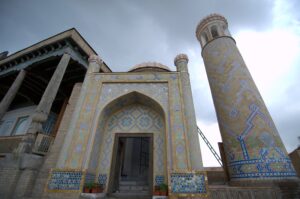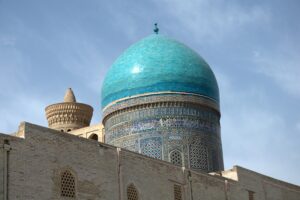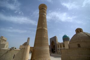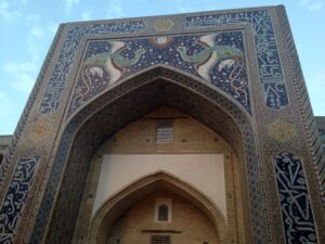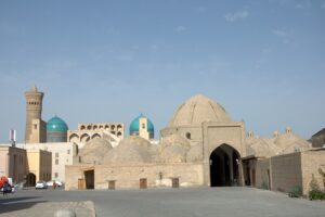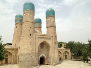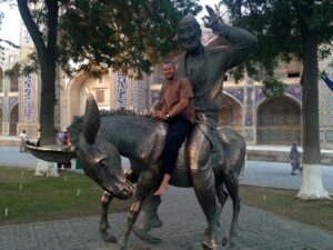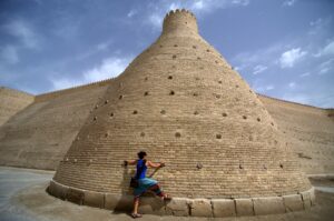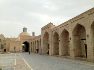 14 Jun – Full day of sightseeing planned for today so we got up early and had breakfast at 7 am. Afterwards, we got lost wandering Bukhara’s streets as we stumbled past the Kalon Minaret and mosque, as well as other neighboring buildings in the area. Next, we strolled over to the Ark where we ran into Kate and Kyle with a large Oasis group and tour leader. Since they were headed to the Zindon “bug pit” (medieval torture pit where poor Stoddart and Connolly suffered at the hands of Khan Nasrullah), we decided to join them to heard what the guide had to say. We later backtracked to the Ark for some photos before crossing the street to check out the Bolo-Hauz Mosque (under renovation). Next up was a visit to Ismail Samani Mausoleum followed by a walk though the square to Chashma Ayub Mausoleum, which is now a water museum. There was a large amusement park so of course we had to ride the Ferris wheel. The weather today was pretty dismal with lots of dust being kicked around. Stumbled across another “crying mother” monument before stopping to check out a couple more medressas. The weather took a turn for the worse and it started raining while we were visiting Abdulla Khan and Modari Khan Medressas. It didn’t look like it would last too long so we waited it out and then strolled back to Bukhara’s free photo gallery. The photographers sell their photos as postcards, making for unique Uzbek souvenirs. Next up was Maghoki-Attar, Bukhara’s oldest mosque. Today it houses a museum of carpets but we were mainly interested in its facade. The last sight we visited today was the exquisite Char Minar. Unbelievably, we had the entire place to ourselves which was enjoyable. After relaxing in our room for a bit, we had dinner at Chinar restaurant, which was excellent (especially the plov).