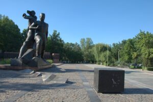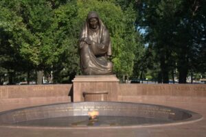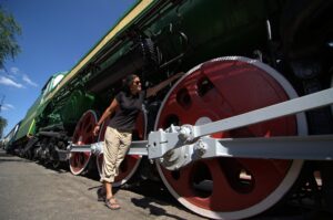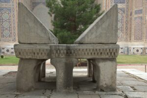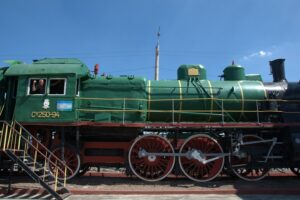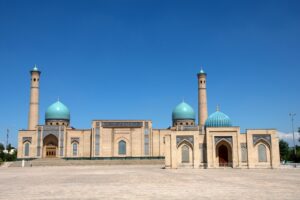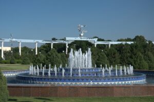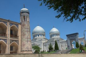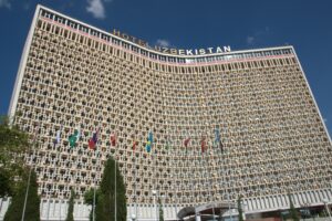 Kulkedash Medressa and the Juma Mosque. From there we walked north to Hazroti Imom Friday Mosque. Afterwards, we met up with Mike, Ben, Brian, Chris and Tina at the Barak Khan Medressa. The Moyie Mubarek Library Museum was closed so we couldn’t see the 7th century Osman Quran. Michael and Brian were keen on visiting the Railway Museum, so we joined them in a taxi while the rest of the group split off to do their own thing. After the museum, Mike and Brian split their own way and we took the metro to the statue of Timur for a short walking tour around Tashkent. Robby had a major mishap while attempting to cross a freshly tarred road. His flipflops blew out big time and he decided to run across the street barefoot…not a good idea since the tar stuck to his skin and was difficult to remove! We made our way over to Independence Square and then over to the earthquake memorial (commemorating the 1966 earthquake that registered at a 9.0 on the Richter scale). Since Becky had to do cook group shopping duty, we caught a taxi back to our hotel. We were picked up by an unofficial taxi, an entrepreneurial family that was returning from shopping in Tashkent. Cook group shopping for Becky, Gill and Ben was pretty easy and straightforward and we were able to keep everything cool since our rooms had refrigerators. It had been a long hot sweaty day so we decided to hit the pool. We were surprised to find Lars swimming by himself so we joined him as we alternated between the pool and sauna. Dinner was leftover rotisserie chicken so we didn’t have to leave the hotel in a quest for food.