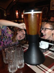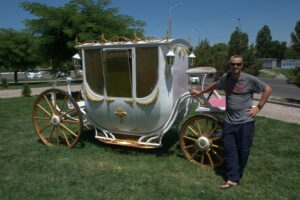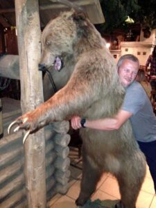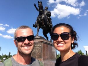 17 Jun – Goodbye Samarkand, hello Tashkent! We departed the hotel at 8:30 am after breakfast and drove all morning long, pulling into Tashkent at 3:30 pm. Ant and Helen were keen on finding a nearby supermarket so we joined them, scoring some rotisserie chicken, bread, chocolate milk and ice cream for dinner. After running into Lars, we heard about that nights plans to leave at 7 pm for some Brau Haus revelry. We were in, so we hopped in a taxi with SCUBA Gill and young Gill and found out that the Brau Haus had closed down (and been replaced by Goodman’s – a steak place with a friendly staff). Our group ordered two giant beer towers which was a good deal split between the 8 of us. Kate was keen on some snacks so she ordered some nuts which ended up being a rip off at 57,000 Som. Several of the late comers were keen on food so they grabbed a meal next door at a restaurant that was filled with dead stuffed animals. Of course inappropriate photos with the animals ensued…hey there was a lot of beer consumed! We needed to exchange a bit more money for Som and found a nearby liquor store willing to hook us up. Then it was another short ride back in a taxi to the hotel where we made our way to the adjacent “Monroe” nightclub (of Marilyn Monroe fame). The night club was not happening at all…and the two girls that were there might have been working girls. Lars had no qualms about dancing by himself on the dance floor but the vibe wasn’t right and everyone was keen on calling it a night. We did hear about Chris’ plans to propose to Tina and were super stoked for the two of them. She has no idea of what he has planned and we couldn’t wait to hear how it all played out.