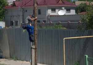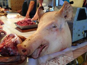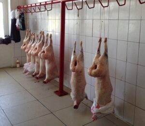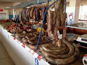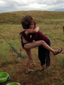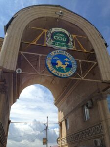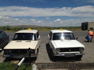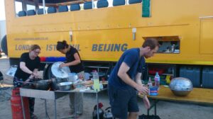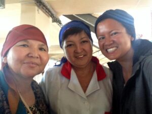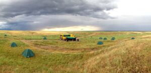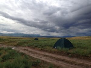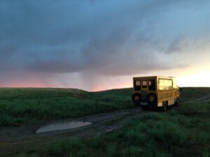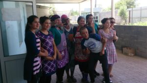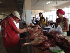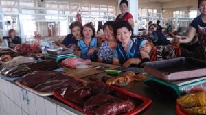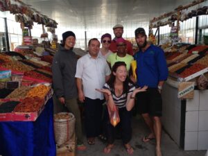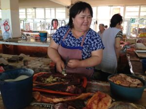 22 Jun – Goodbye Aksu-Zhabagly! We packed up and left by 8:30 am and drove to Taraz for cook group shopping. Robby scored some size 46 flip flops at the market although it took quite a herculean effort since most sellers didn’t carry anything above 44. The vendors at this market were quite happy to pose for photos, especially in the meat section. Then it was a long afternoon drive out to the next bush camp, our last one before entering into Kyrgyzstan. Since it was Robby’s last chance to dress up as Borat, he took full advantage of the early bush camp to prepare his bin-bag costume. Becky had to approach Kate twice for supplies (tape and magic marker) piquing her interest about what was going on. The surprise was revealed a few minutes later when Borat rocked up at our campsite and gave Kate a full on hug much to her chagrin. Priceless photos ensued! Unfortunately, that wasn’t the highlight of the night. As cook group (Helen, Bjorn and Denise) were preparing a delicious lamb tagine, Michael and Ben were tossing a tennis ball around. Poor Ben tumbled into a ditch while catching the ball and ended up breaking his leg! He probably could have taken a tumble 100 times and come out unscathed 99 times but tonight was his unlucky night. Ant, Chris, Tina, Michael and Kate accompanied him to the hospital along with Kate F and Kyle. The rest of us were literally left on our own in the middle of a remote bush camp. We had a spectacular sunset and then torrential rain started coming down so everyone ran back to their tents to take cover. The rain was crazy enough but then the lightning started kicking in and we were wondering if we’d make it through the night unscathed. One of the more memorable bush camps of this trip to be sure! The hospital gang stayed at the hospital all night long and we waited to see what the morning would bring since tomorrow was supposed to be a border crossing.
