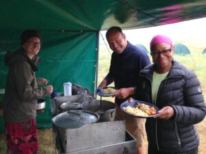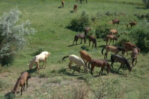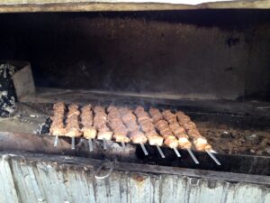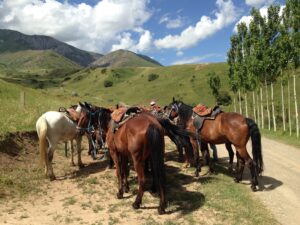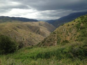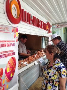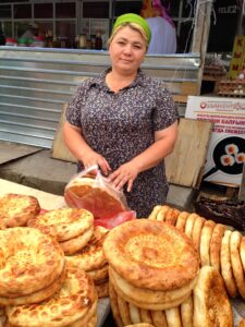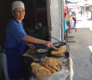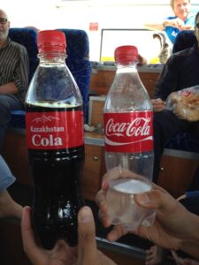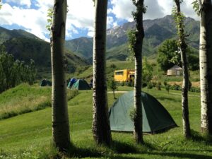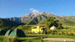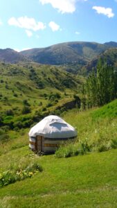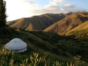 20 Jun – Early morning as we had breakfast and departed by 7 am. The morning priority was cook group shopping and money exchange so we drove until we found a city that met both needs. Since the black market rate was nonexistent, we figured using an ATM would give us the best rate and took out 2500 Tenge (KZT). Then we wandered around the market and searched for bread (Becky’s cook group needed some for lunch). After a brief lunch stop, we drove all afternoon until we reached the Ruslan campsite at Aksu-Zhabagly Nature Reserve. What a beautiful location! We were told where we could set up our tents and Kate did a head count on how many of us were interested in riding horses versus hiking tomorrow (horse riding please!). After dinner, we celebrated Bjorn’s birthday with cake and drinks and chatted around the camp fire (joined by some German motorcyclists who were also camping nearby). Its amazing how quickly the temperature dropped once we crossed the border from Uzbekistan into Kazakhstan! It was so cold that we had to dig around our locker to search for our snivel gear. Our Turkish ponchos made an appearance (Lars, Becky and Ichi) and were worth every penny.